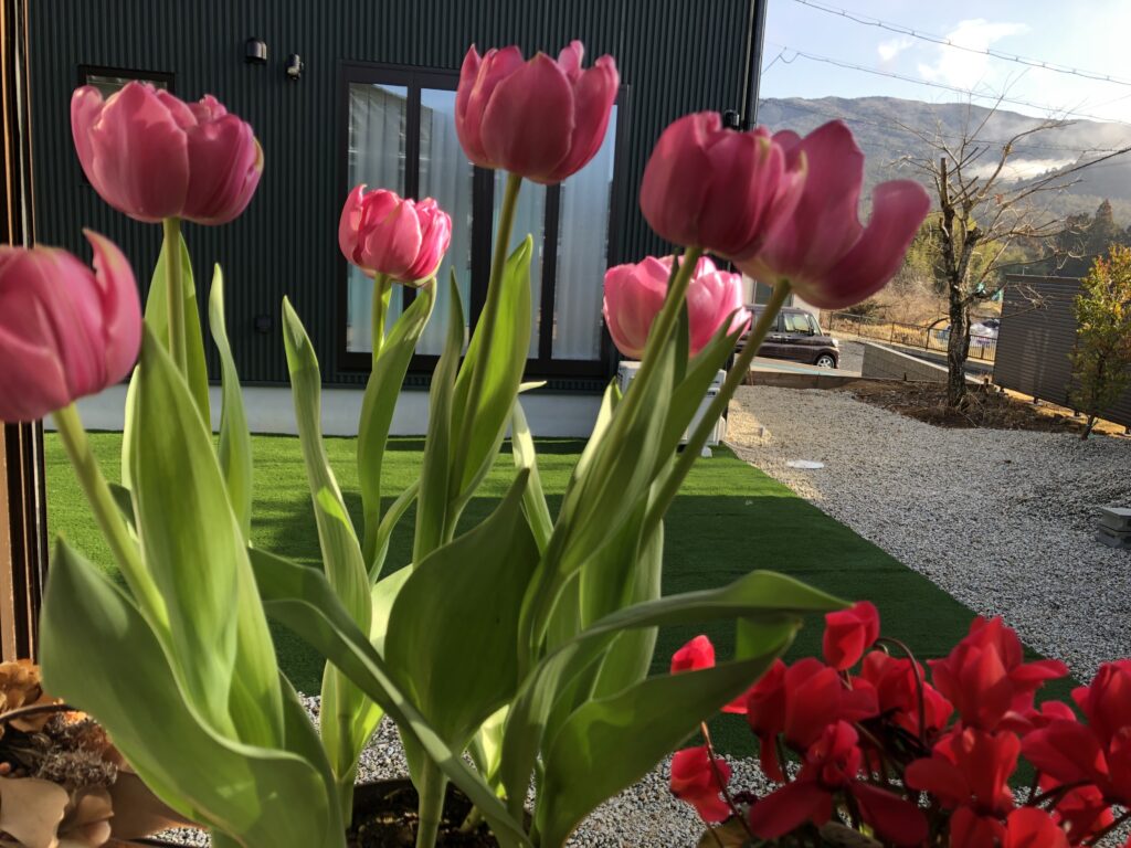 チューリップの葉の緑、人工芝の緑、そしてガルバの