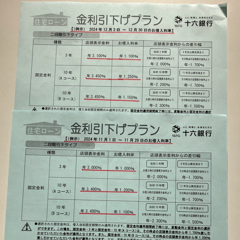 今月、十六銀行の住宅ローン金利表を受け取りました。