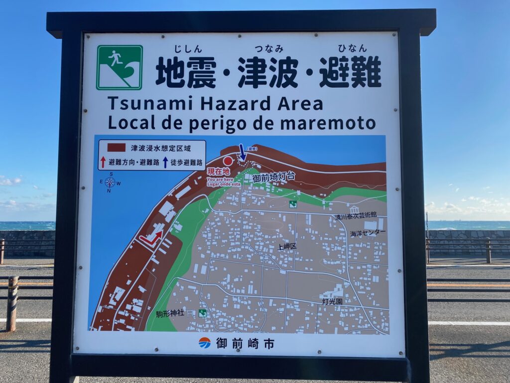 昨日、私は静岡県御前崎市を訪れる機会がありました。この地域は太平洋に面しており、地震と津波のリスクが特に高いエリアです。写真にもあるように、海岸線だけでなく内陸部にも「津波浸水想定区域」を示す看板が設置されています。また、海抜を知らせる案内板も多く見られ、地域全体で防災意識が高まっていることを実感しました。