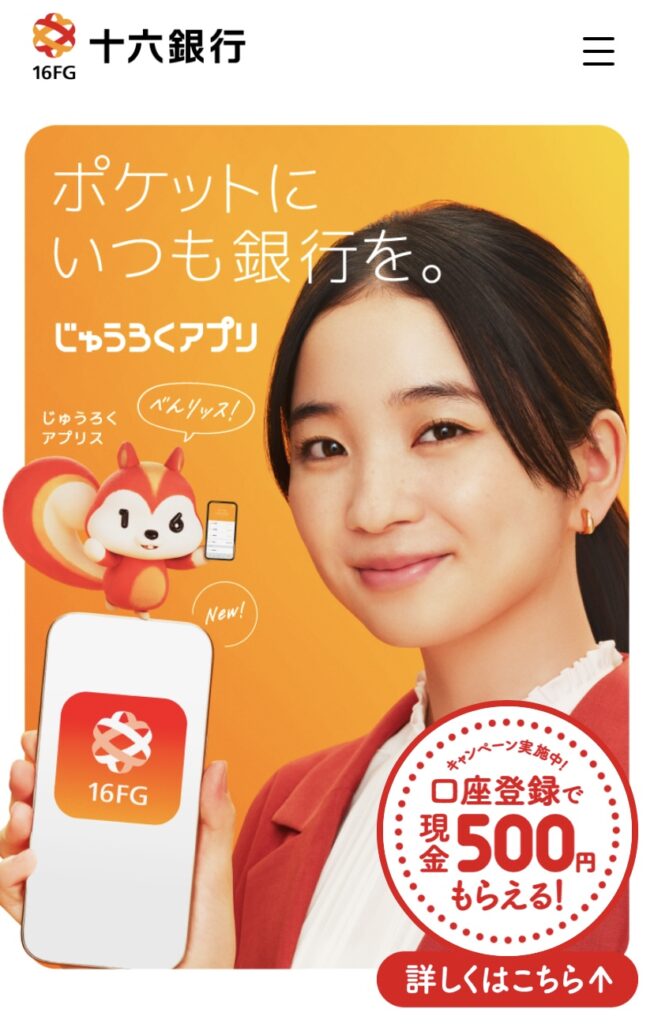先日、新聞の折り込みチラシで「十六銀行のアプリに登録すると、500円のキャッシュバックがもらえる」と知りました。