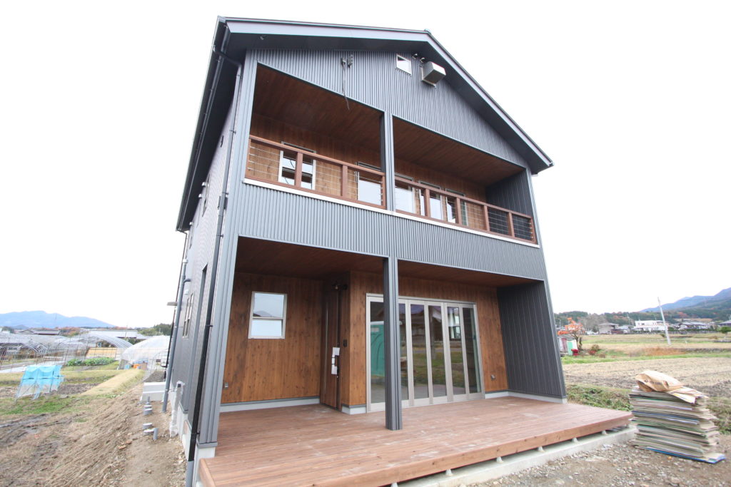 外観の正面は木を壁に貼り、ウッドデッキも造りました。