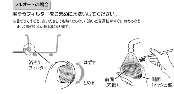 ①まずはフィルターの清掃、これはこまめに(出来ればお風呂掃除の都度)必要です。
