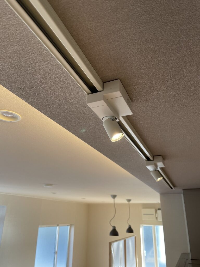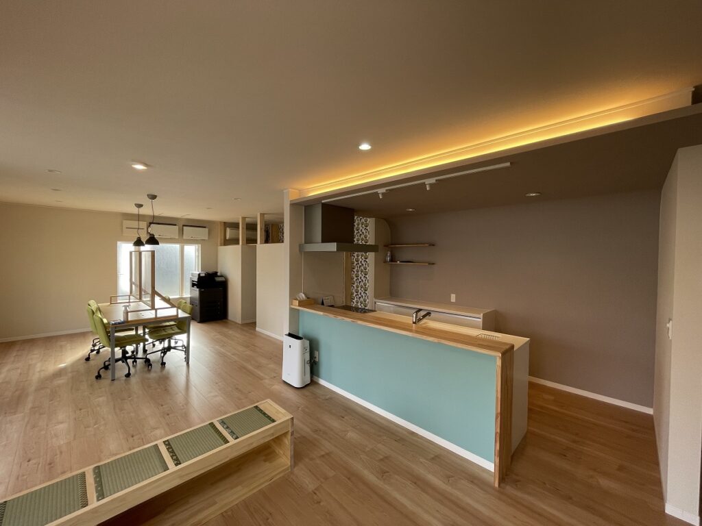キッチンは一部天井を下げて、少し暗い色の天井を選んでいます。