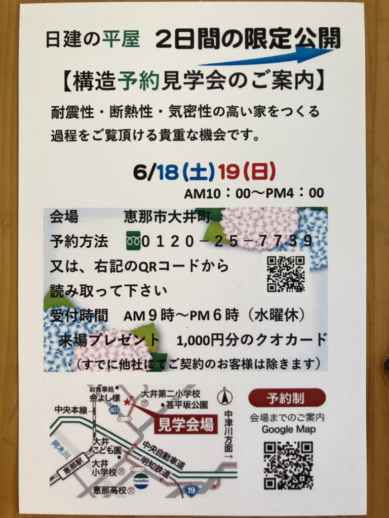 2022/6/14 お知らせ見学会 投稿者:STAFF4 6月18・19日は予約見学会 こんにちは、中津川市にある工務店日建建設の永冶です。 カエルの合唱が毎日賑やかに聞こえます。 中津川市はまだ梅雨に入ってないので、 カエルは待ち遠しいようです。 6月の見学会のご案内ハガキは届いていますか? 届いてないけど詳細を知りたいと思われた方、 こちらをご覧ください。 ・建築中の現場が見えます。 ・9月に完成見学会があります。見比べて頂くのも楽しいです。 みな様のご連絡をお待ちしております。