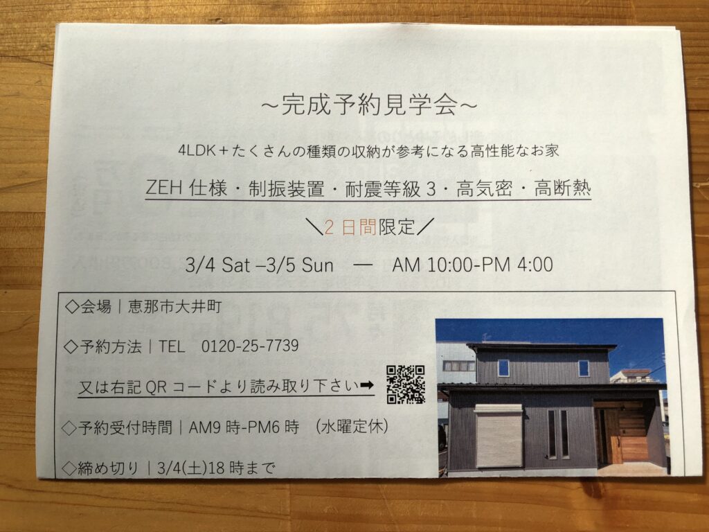 2023/3/3 お知らせイベント行事見学会 投稿者:STAFF4 明日から見学会です。 こんにちは。中津川市にある工務店日建建設の永冶です。 3月はどのご家庭も行事が多いですね。 弊社も今月は見学会が通常の月より多くありますよ。 先ずは、3月4(土)~5日(日) 恵那市大井町にて開催です。 予約見学会の為、早めのご連絡お待ちしております。 3月18日(土)~19日(日) こちらはオープン見学会です。 久しぶりのオープン見学会!OBのみな様も遊びに来てくださいね。 温度差が大きい季節です。体調、気を付けましょうね。