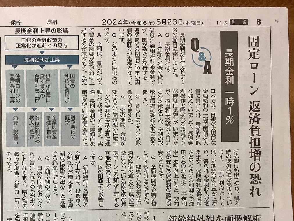 2024/5/23 お知らせ 投稿者:営業 藤原 住宅ローン金利、今後どうなる? こんにちは。 『固定ローン、返済負担増の恐れ』今日の新聞の記事です。 長期金利が一時、1%を超えましたので長期金利に連動する 固定期間10年を超える住宅ローンの金利が上がるかもしれないということです。 住宅ローンはご存知の通り長期に渡り返済をしていくものです。 少しの金利上昇でも毎月返済額はもちろんですが、返済総額も大きく変動します。 これからは家計の見直しなど、しっかりと行う必要がありますね。 ファイナンシャルプランナーの藤原でした。