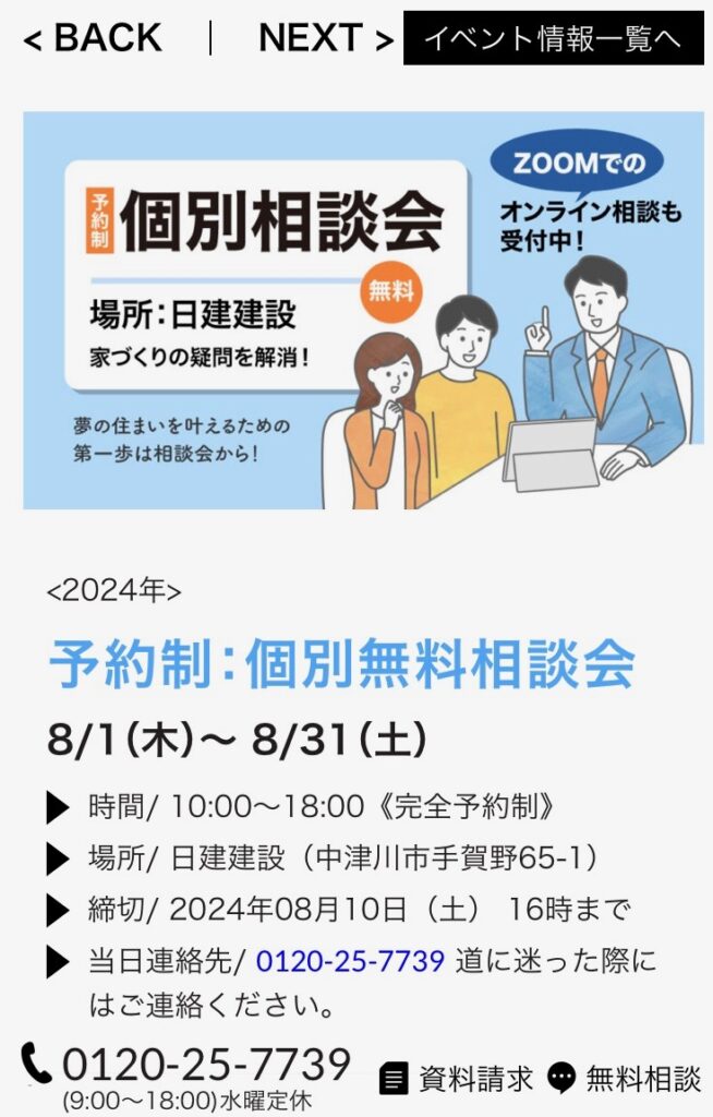 2024/8/3 お知らせ 投稿者:営業 藤原 8月の個別相談会・中津川市手賀野 こんにちは。 中津川市にある工務店、日建建設の藤原です。 8月に入りました。相変わらずの猛暑ですので熱中症に注意しましょう。 好評につき、毎月開催しています、個別相談会を今月も行います。 初めてのマイホーム、何から始めて良いか分からない方が多いと思います。 経験豊富なスタッフがアドバイスをさせて頂きます。相談を行ってからは 当社が実際に建築したモデルルームを見ながら間取りについてもアドバイスを 致します。お気軽にご連絡ください。