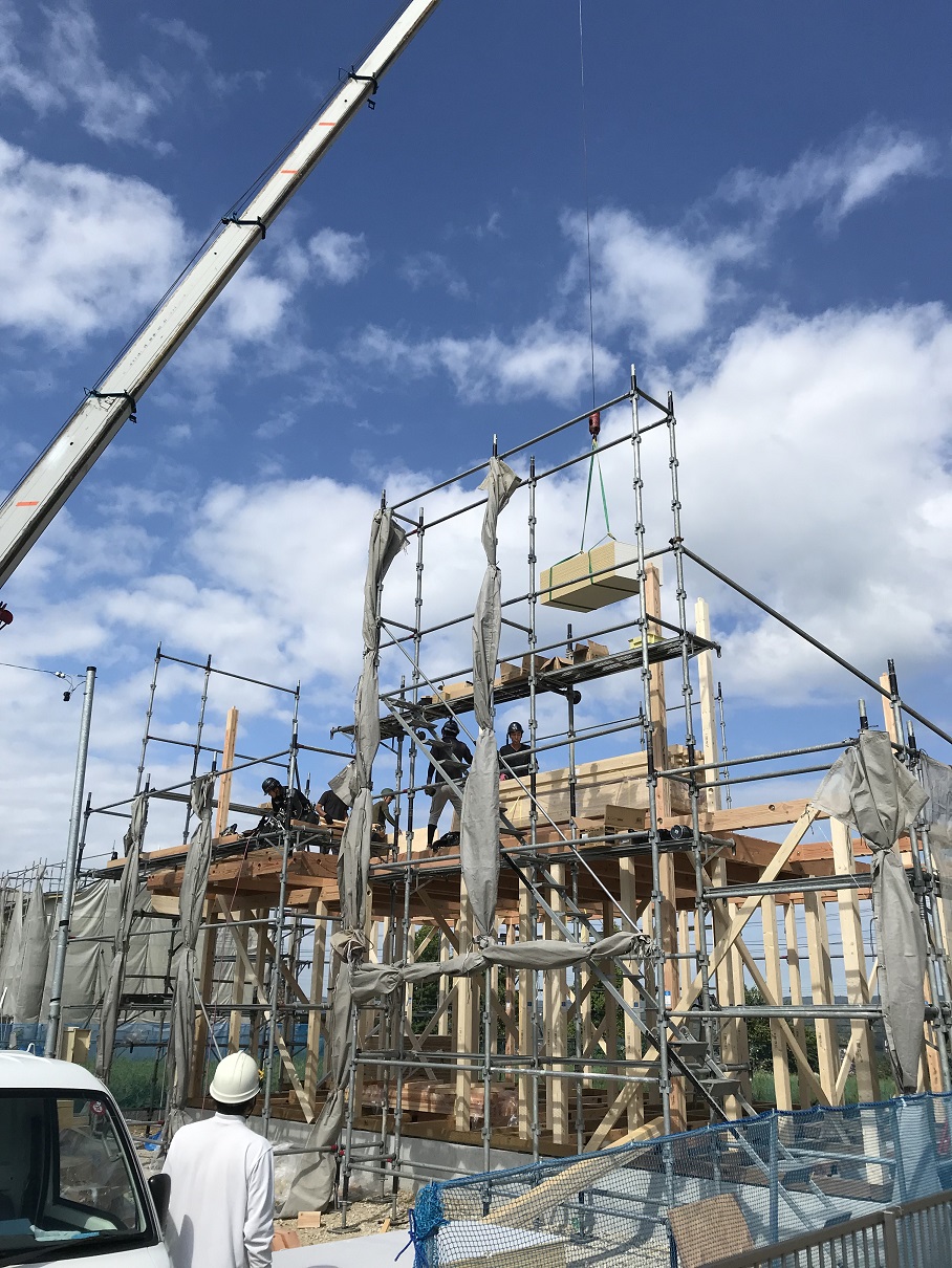 クレーンで吊っているのはプラスターボード(石膏ボード)