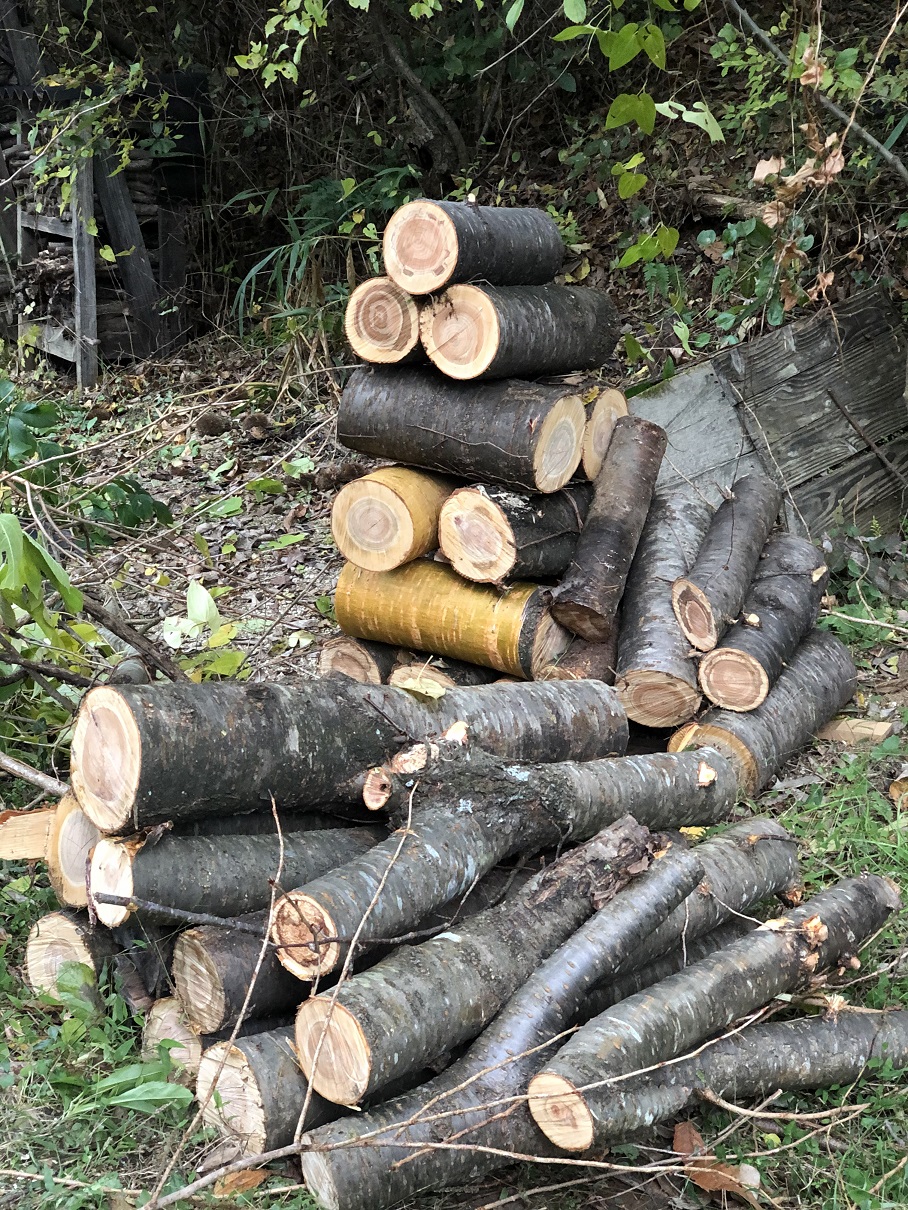 写真は裏山の間伐材、ピザ窯用ですが、既に3つの棚も埋まっているので、十数年分は貯まってしまいました。