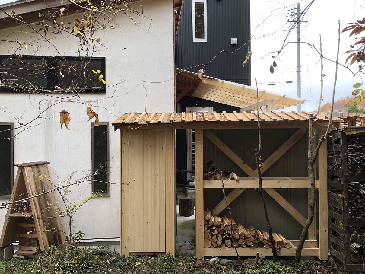 ※写真は調整不可能な薪棚横の道具入れのドア