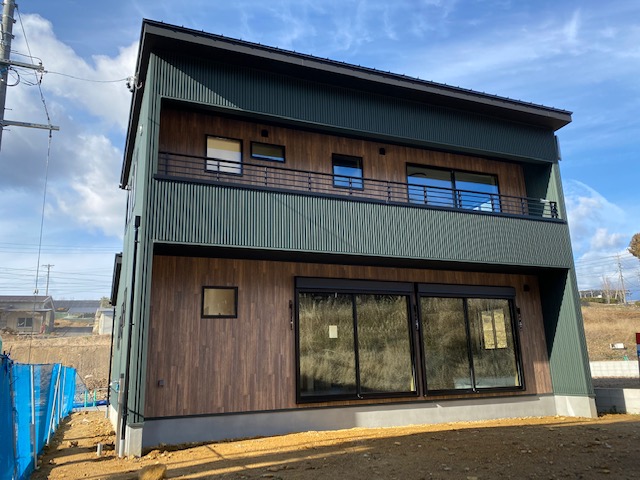 外壁はモスグリーンのガルバでスタイリッシュに仕上げました。