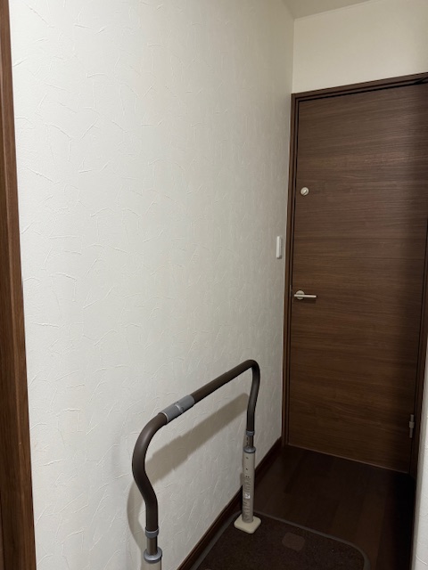写真の家は、将来的に手摺を付けるように計画しており下地だけは入れてありますので、後は手摺を注文して取り付けるだけです。(写真の手摺は、介護保険を利用した1割負担のレンタル手摺です)
