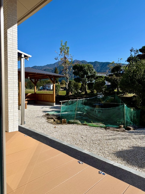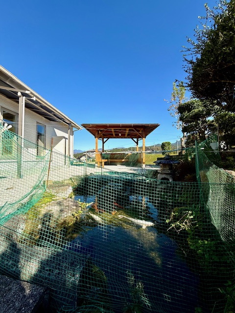 庭の池と東屋で、くつろげる空間になっています。白い鯉きれいです。
