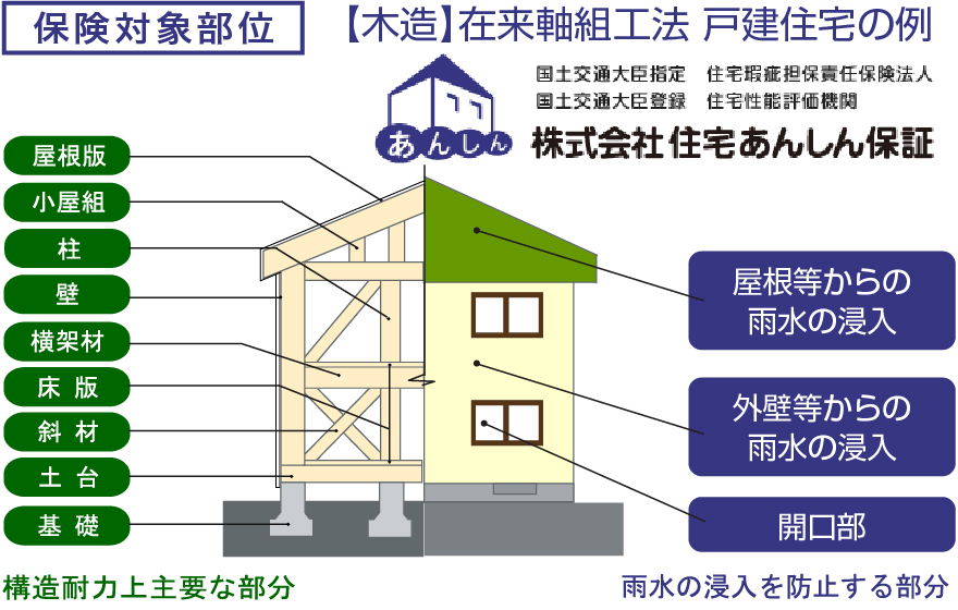 保険の対象となる部分は、住宅の品質確保の促進等に関する法律第5条第1項および第2項に規定する「構造耐力上主要な部分」と「雨水の浸入を防止する部分」で、構造耐力性能または防水性能における瑕疵が保険の対象です。