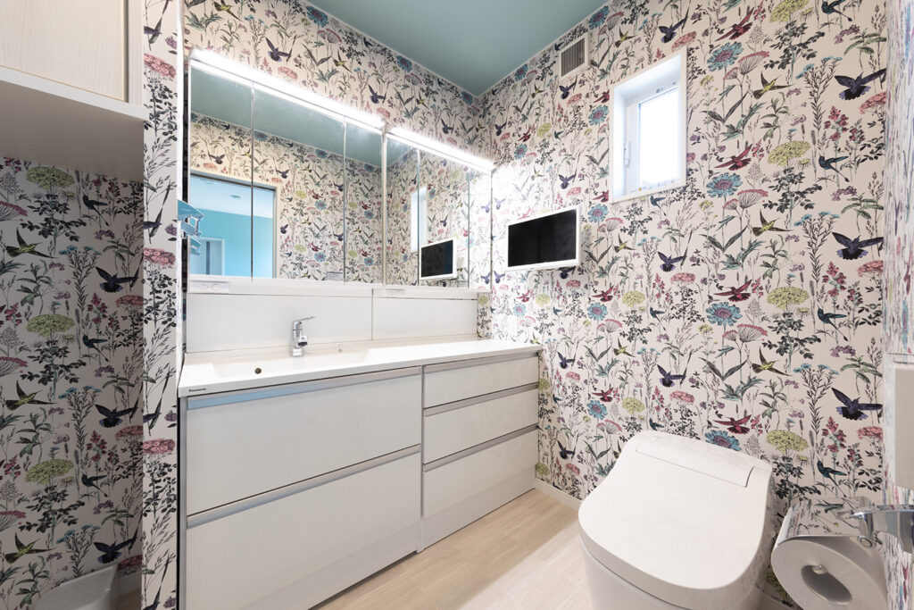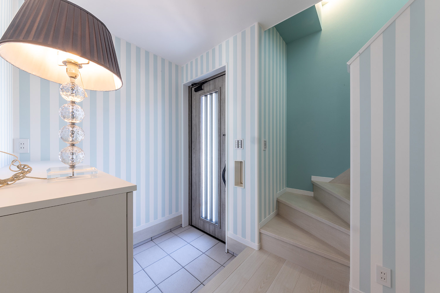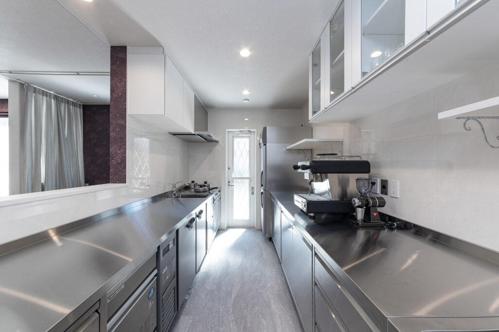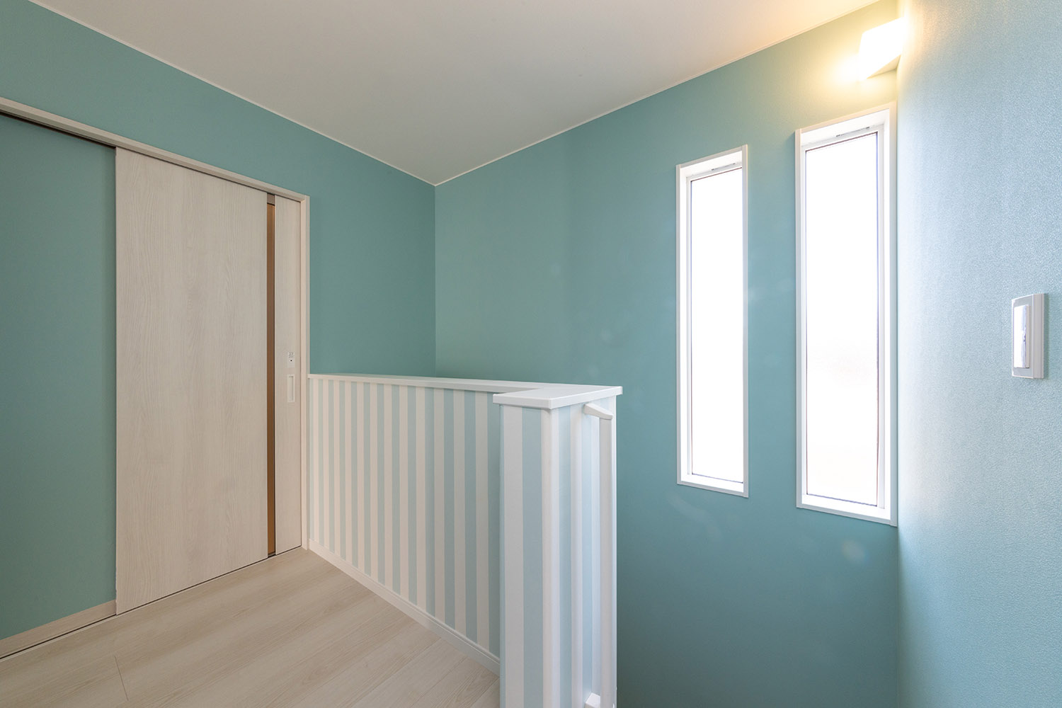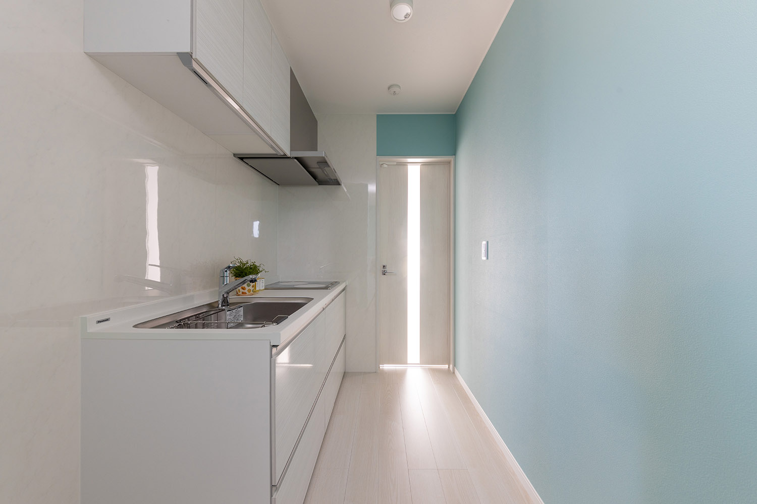 ミントブルーの壁が爽やかな印象を与える2階キッチン。シンプルで機能的なデザインが魅力です。