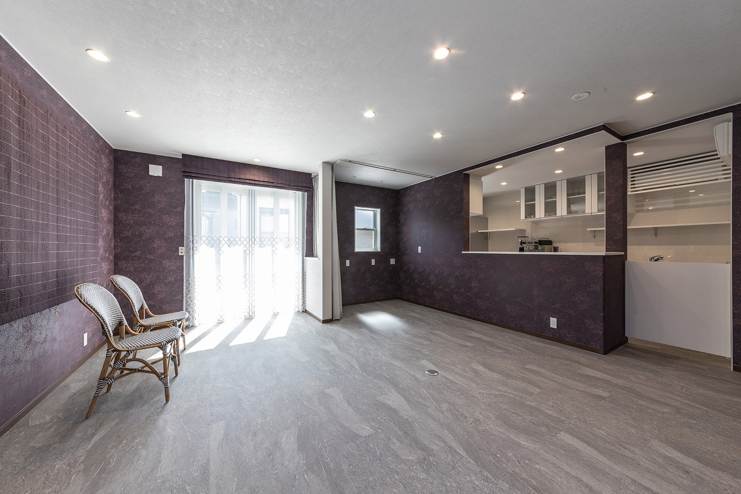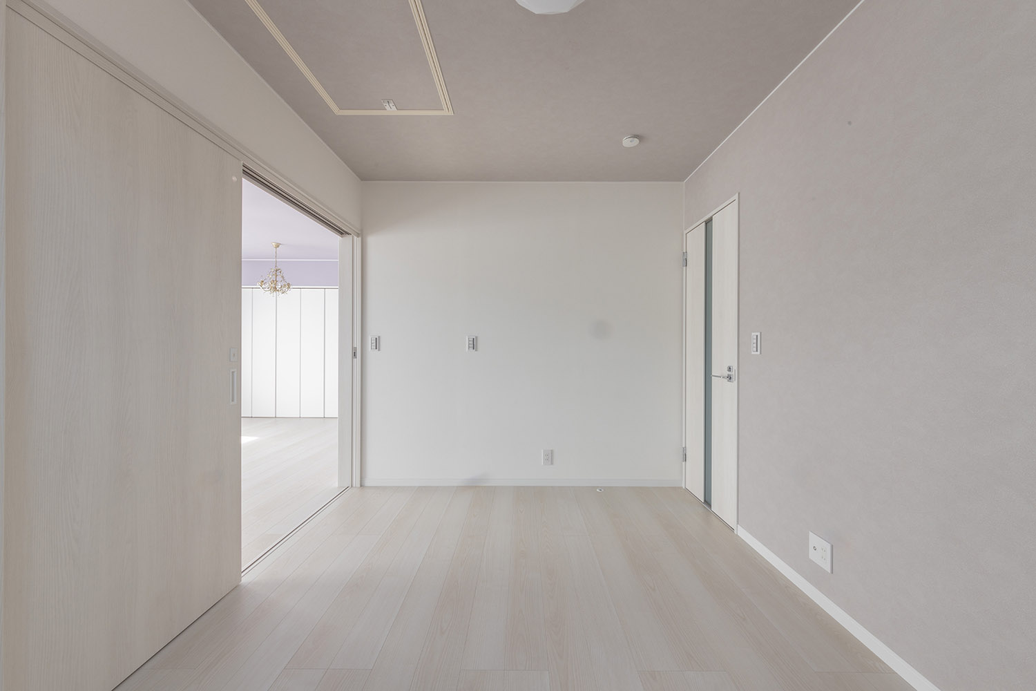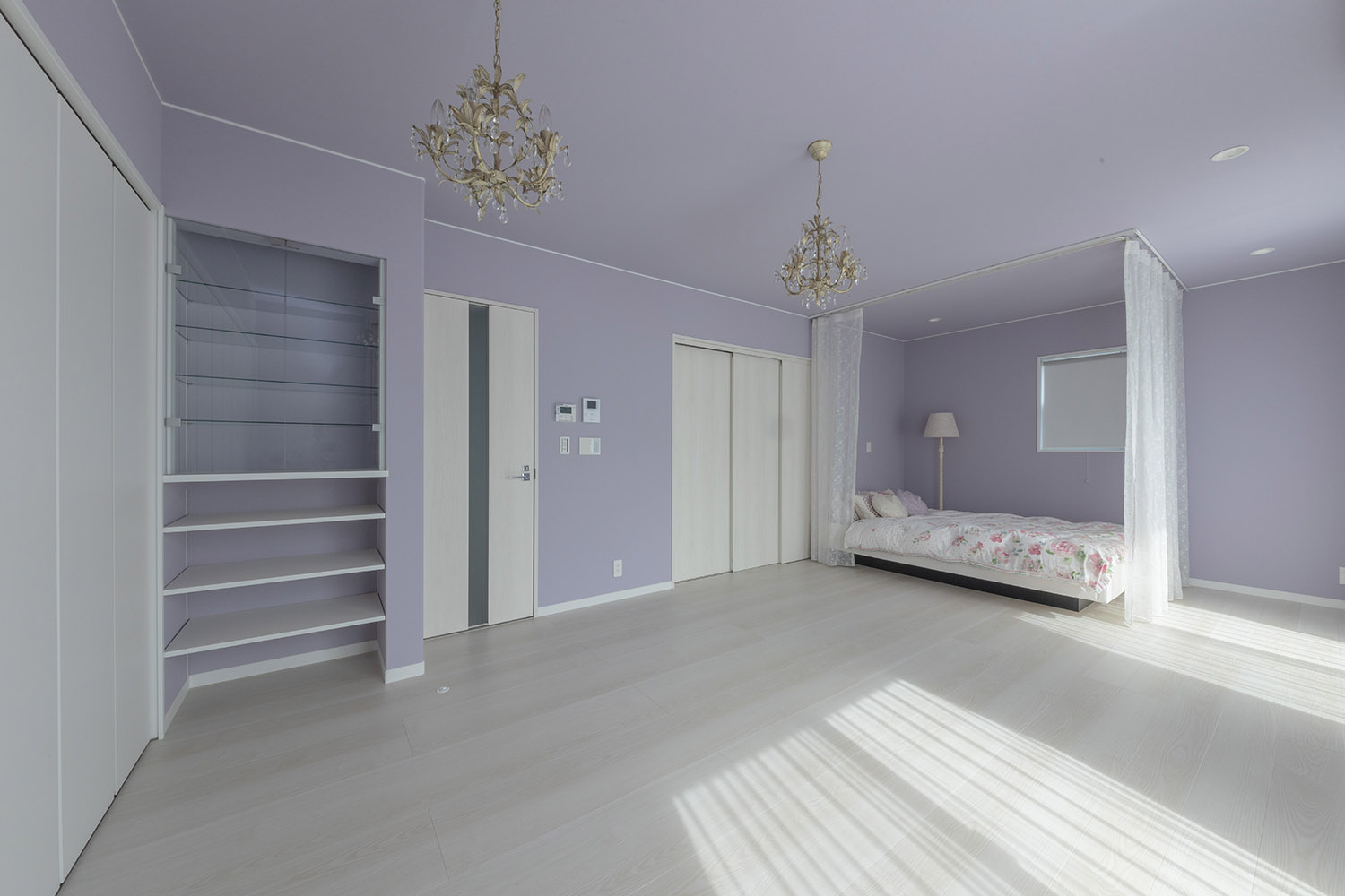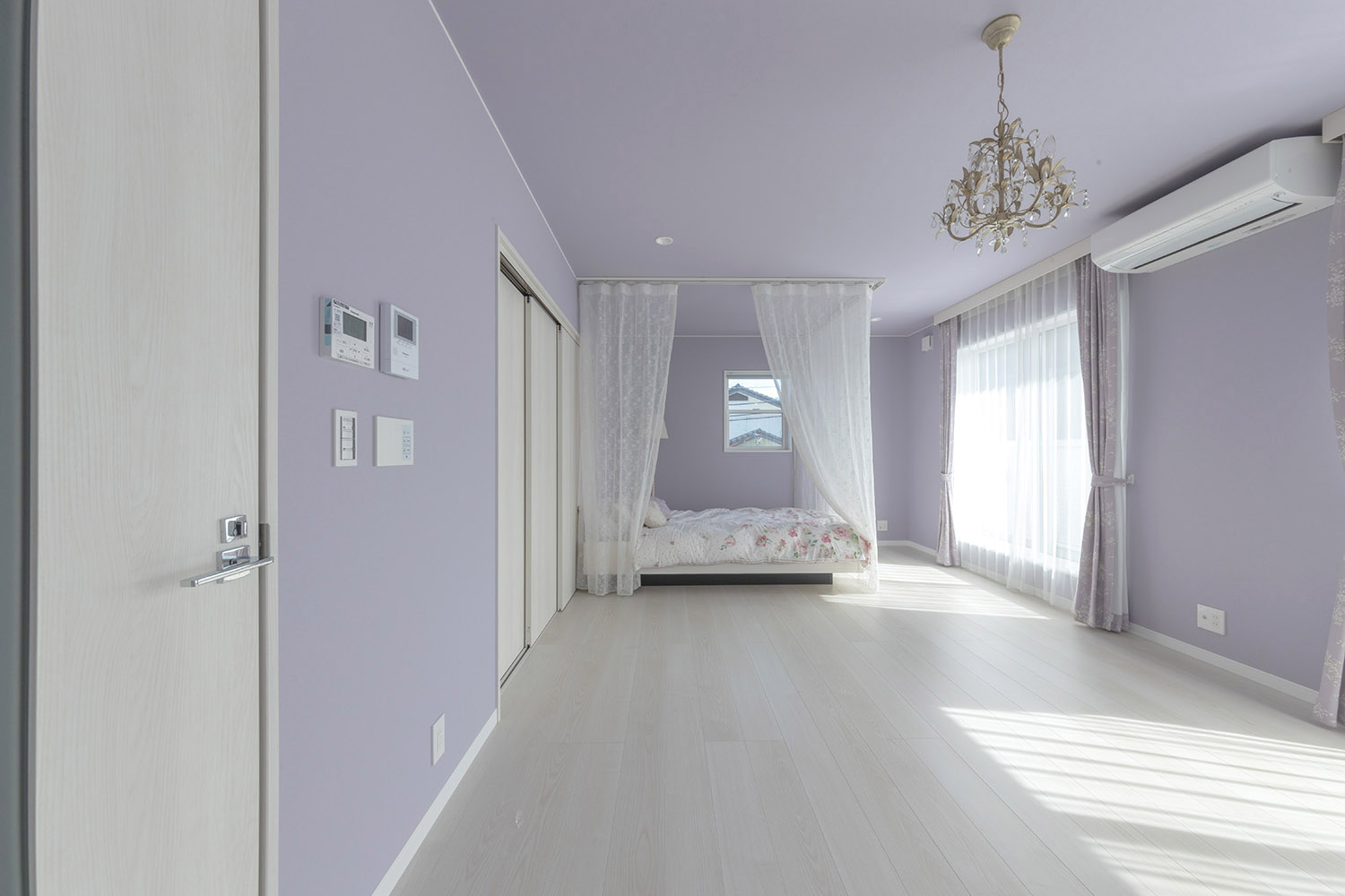 ラベンダーカラーが上品な14帖の主寝室。レースカーテンとシャンデリアが優雅な空間を演出します。