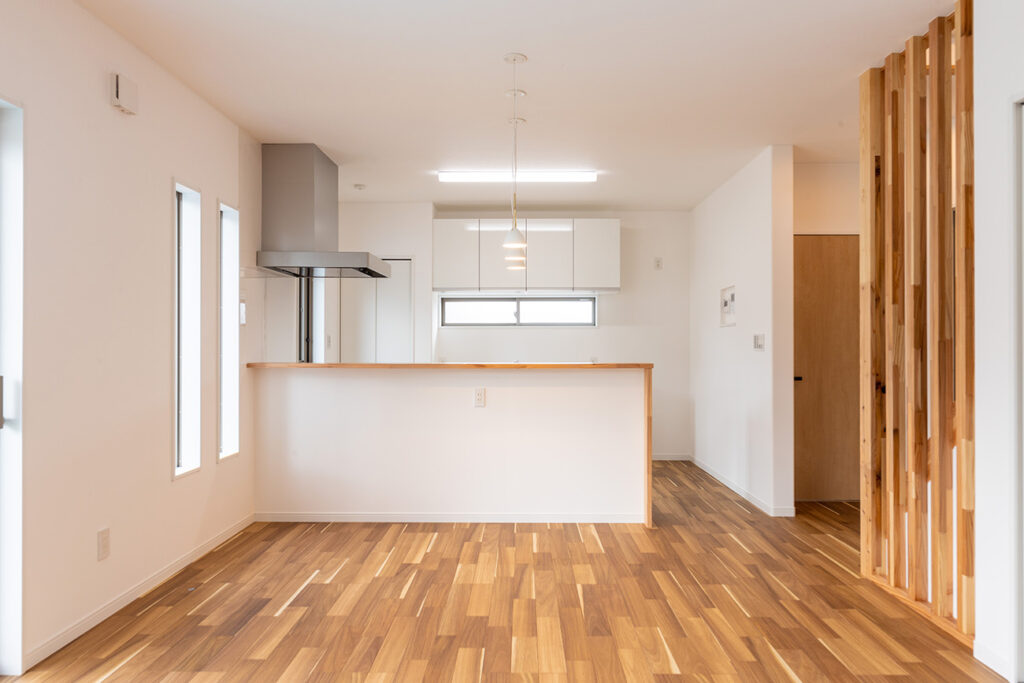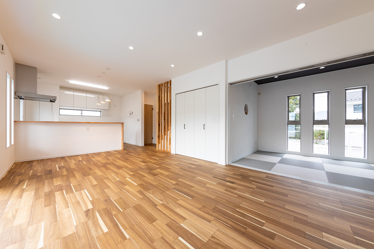 開放感あふれるLDKは、キッチンから和室まで見渡せる設計。家族のつながりを感じる心地よい空間です。