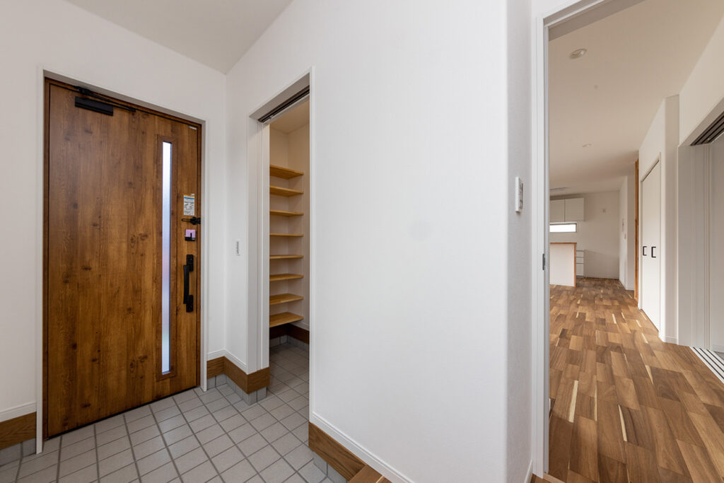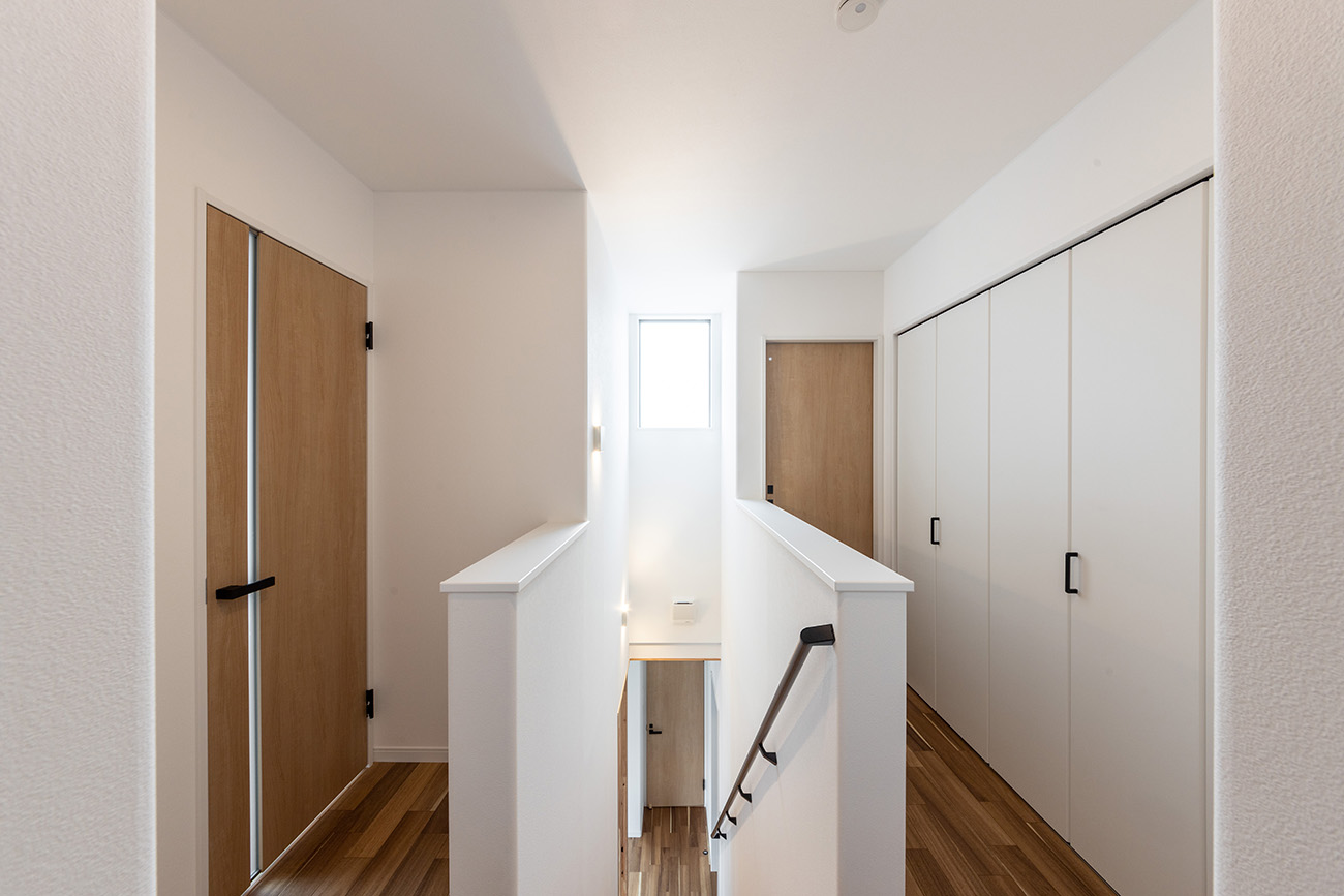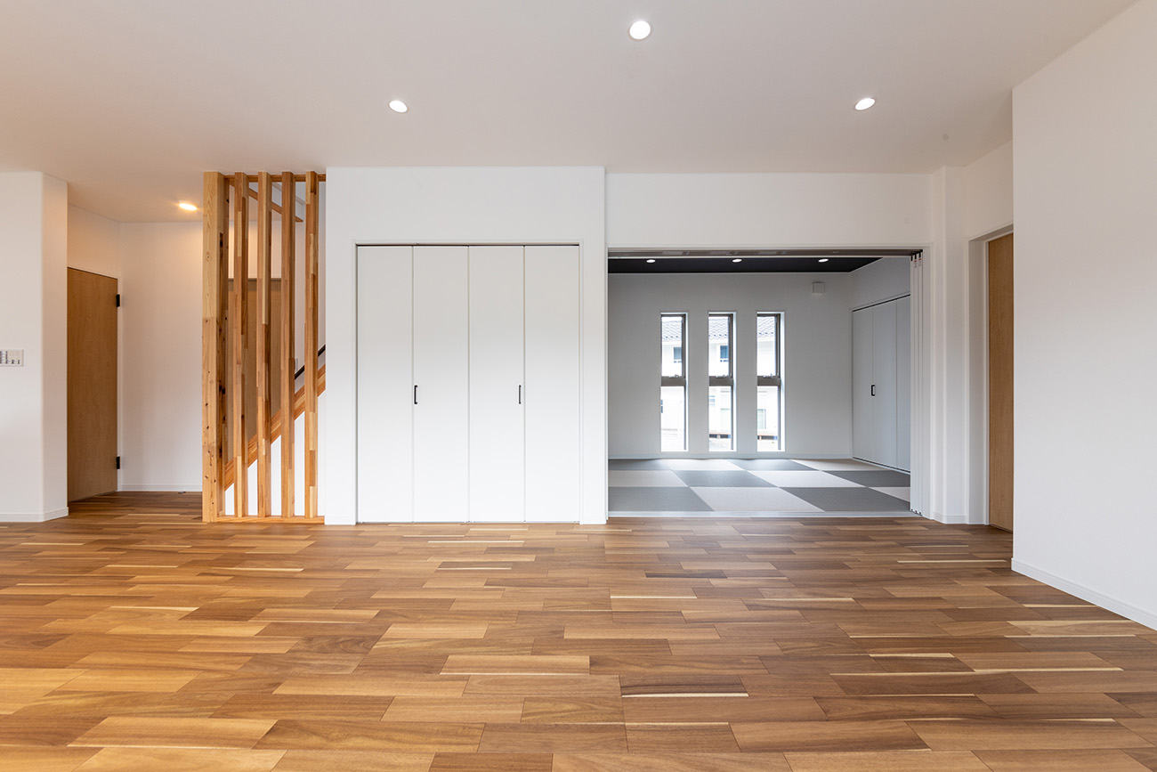 木の温もりあふれる床材と、格子のデザイン階段が空間にリズムを。奥の和室が暮らしにゆとりを添えます。