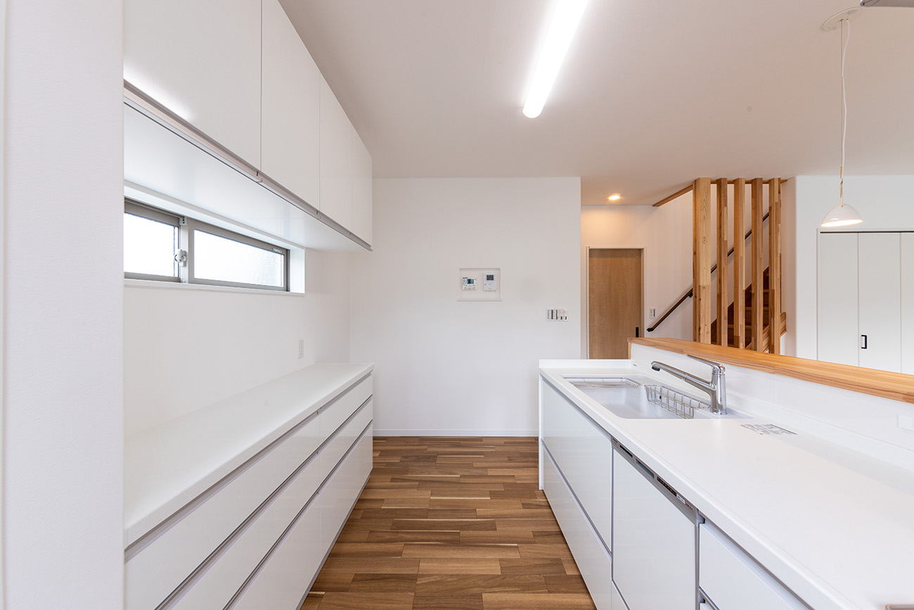 清潔感あふれる白基調のキッチン。たっぷりの収納と広々カウンターで、毎日の料理がもっと快適に。