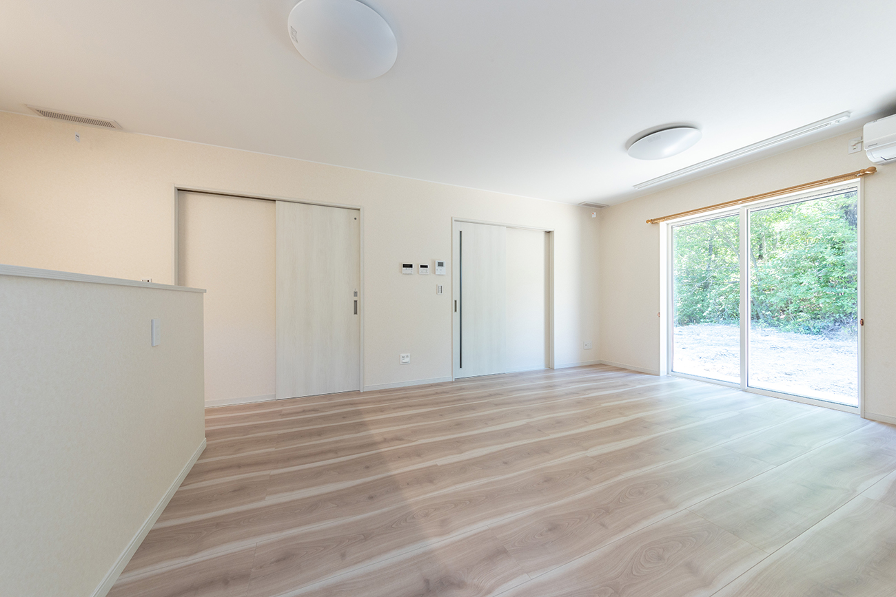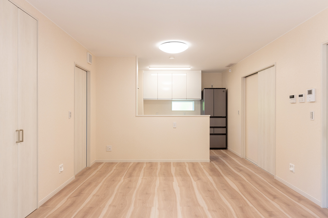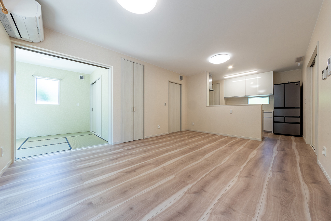 明るい木目フロアが広がるLDK。隣接する和室は、客間やくつろぎの場として多用途に活躍します。