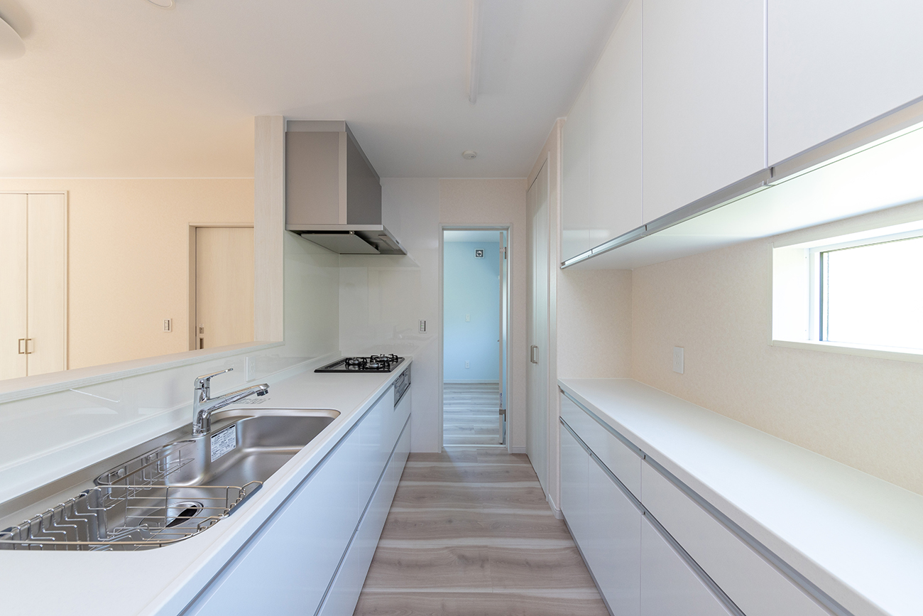 キッチンとゆるやかにつながるダイニングは、配膳もスムーズ。シンプルで温もりある空間が、夫婦の会話を優しく包みます。