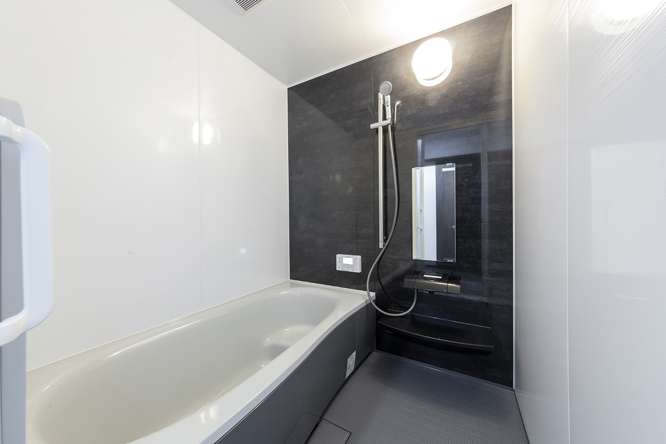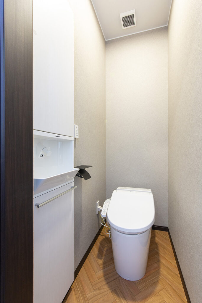 温水洗浄便座や換気機能も完備し、快適性も抜群です。木目調のフロアで温かみもプラスしました。