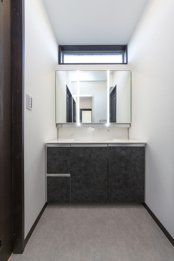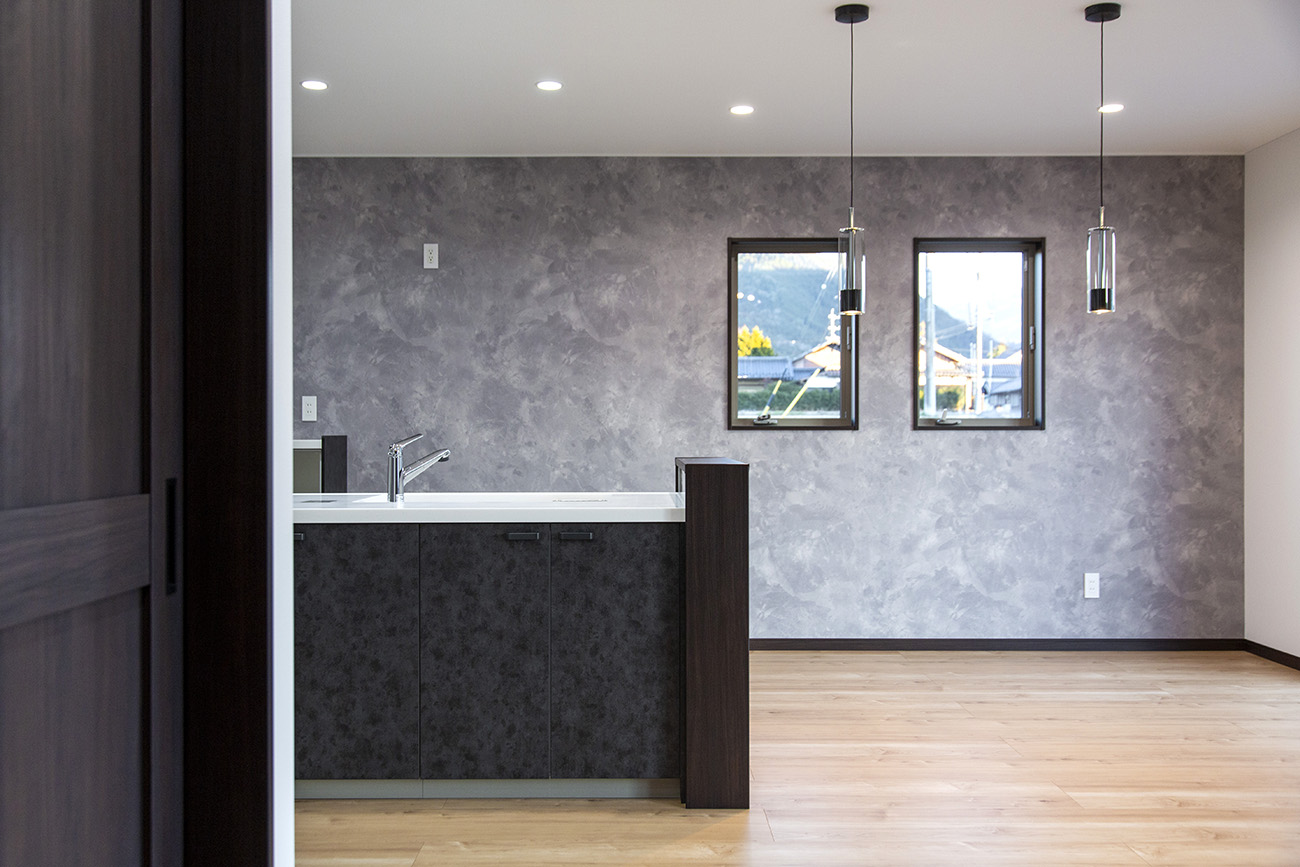 奥行きあるグレーの塗り調クロスが、キッチン全体に上質感を演出。小窓から差し込む自然光とペンダントライトの陰影が、空間にやさしいリズムを生み出します。料理の時間がちょっと特別になる、そんな設計です。