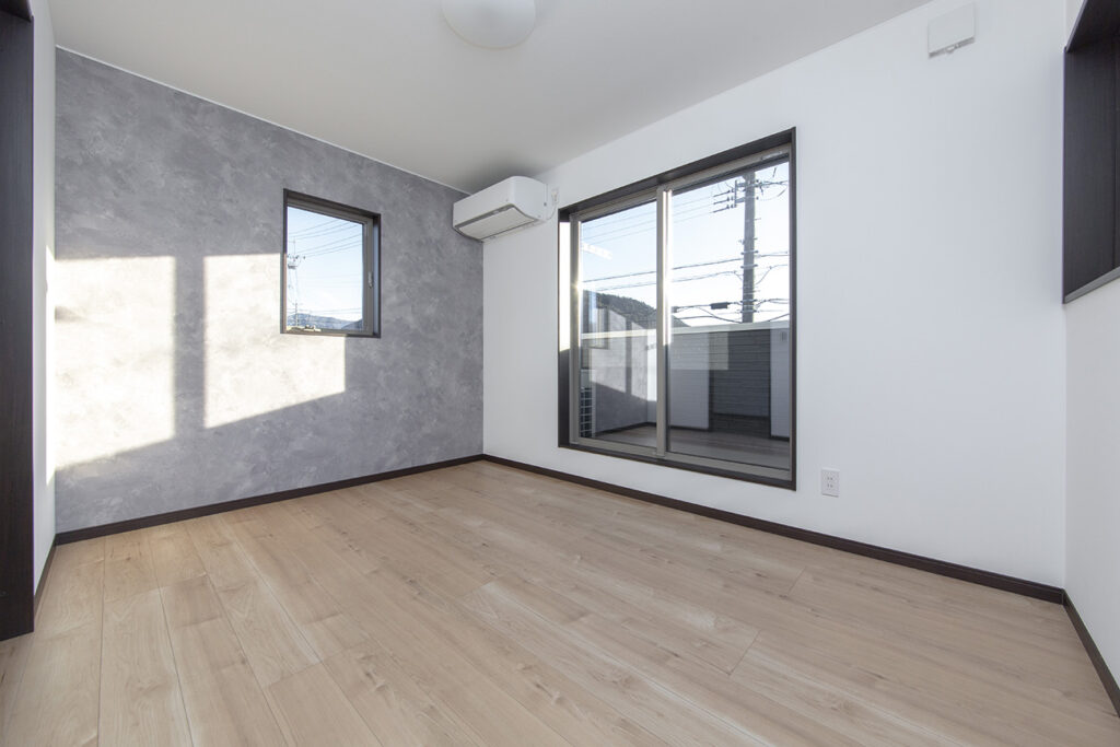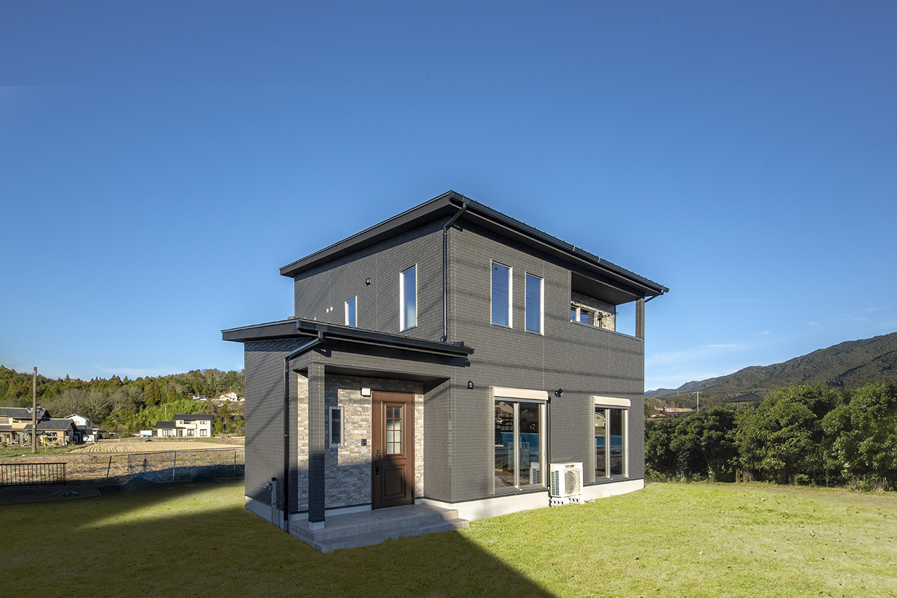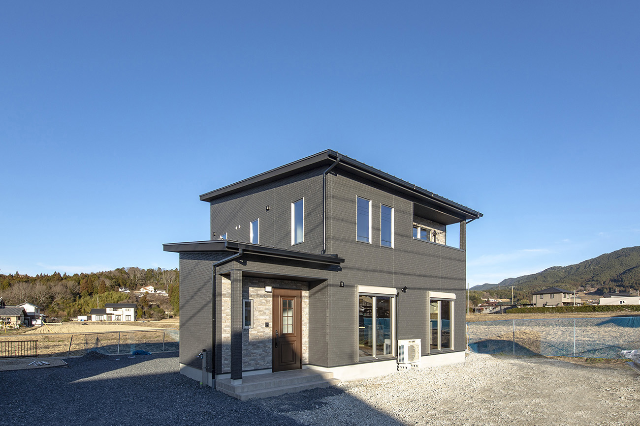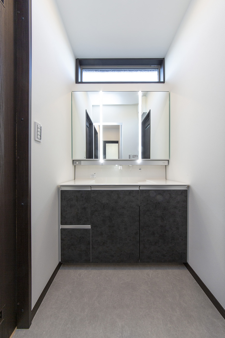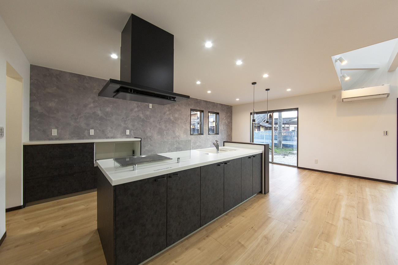 マットグレー調の壁と重厚感あるダークトーンのキッチンが調和した、モダンで落ち着きある空間。アイランド型の対面キッチンは、料理をしながら家族との会話も楽しめる、まさに“暮らしの中心”です。