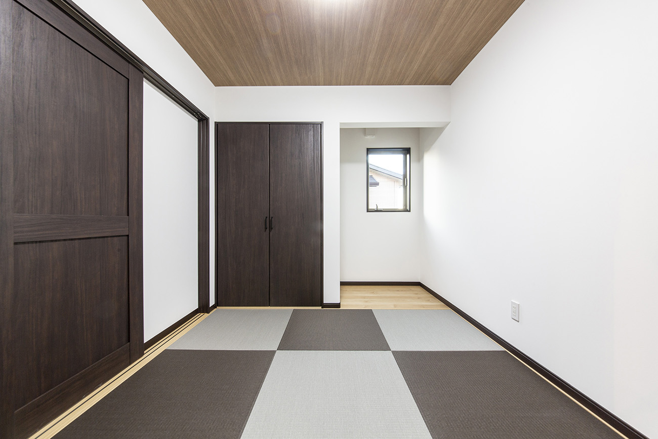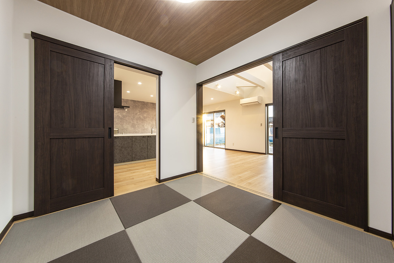 ダイニング横に設けた、落ち着きある和モダンスペース。市松敷きのカラー畳と木目の天井が空間に奥行きを与え、ちょっとしたくつろぎや来客時の予備室としても重宝します。和と洋を美しく繋ぐ設計です。