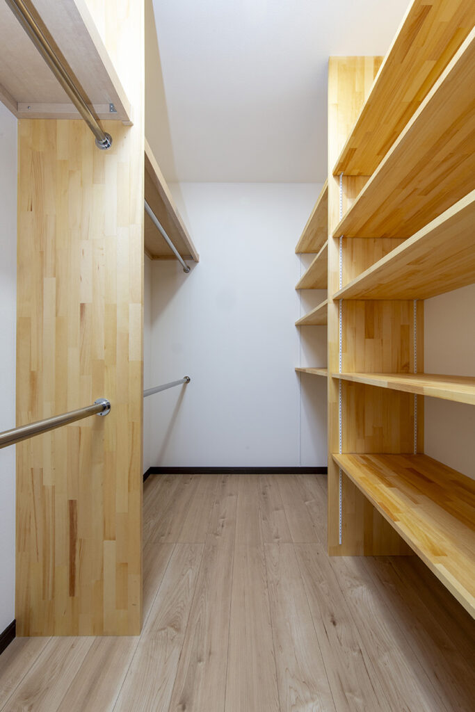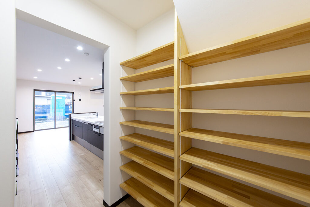 キッチンと直結した可動棚付きのパントリーで、食品や日用品をたっぷり収納可能。家事動線が短くなることで、日々の準備や片付けもスムーズに。木の質感が優しい印象を与える、見た目と使いやすさを両立した空間です。