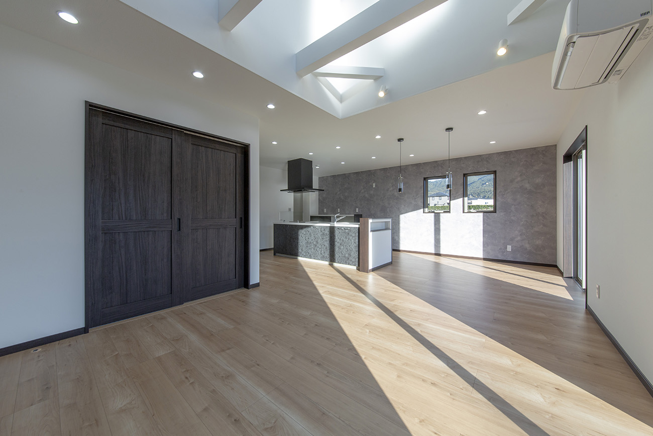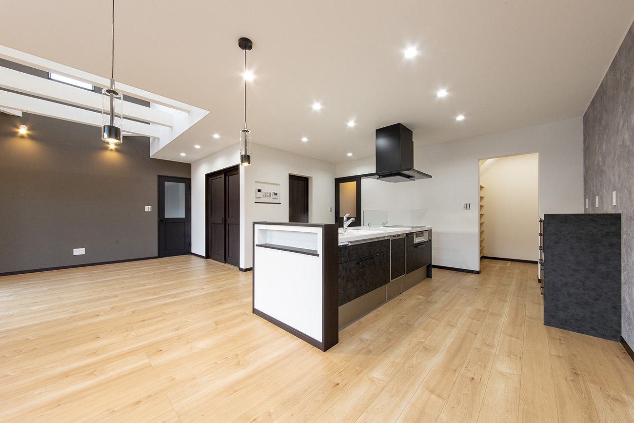 開放感のある天井と自然光が心地よいLDK空間。ブラックのアクセントと木目フローリングが絶妙に調和し、スタイリッシュで落ち着きのある仕上がりに。キッチン横には使い勝手の良いパントリーも完備しています。