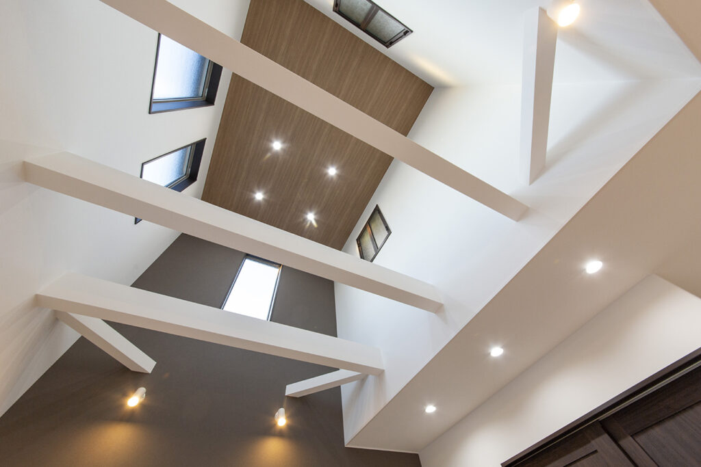 吹き抜けに大胆に配置した白い梁が、空間に立体感と奥行きを演出。高窓から自然光がたっぷり入り、日中も明るく開放的なリビング空間に。