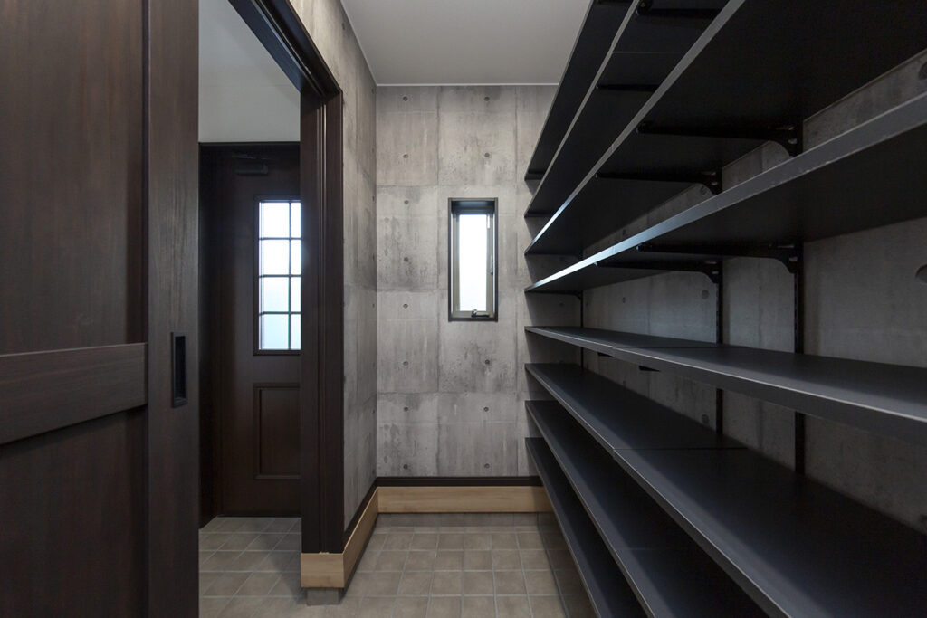 コンクリート調のクロスと黒の可動棚が、土間収納に都会的な雰囲気をプラス。靴やアウトドア用品もたっぷり収まる大容量設計。