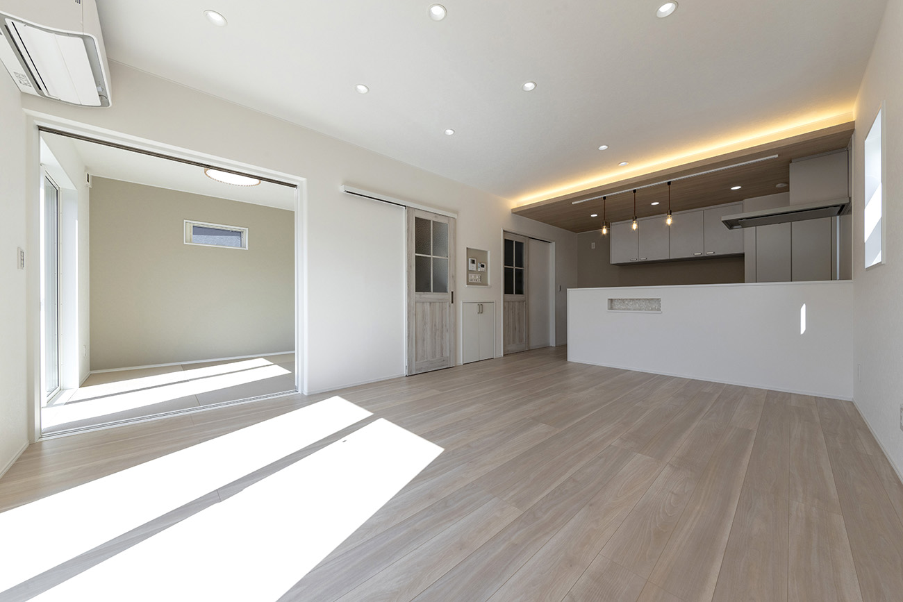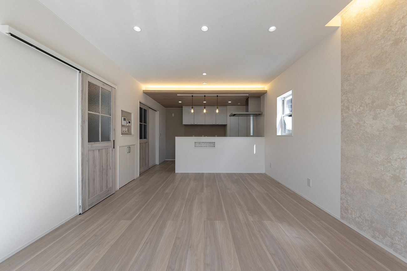 床・天井・建具までトーンを揃えた、統一感あるナチュラルなLDK。間接照明とペンダントライトがやさしく灯り、温かみのある雰囲気に。
