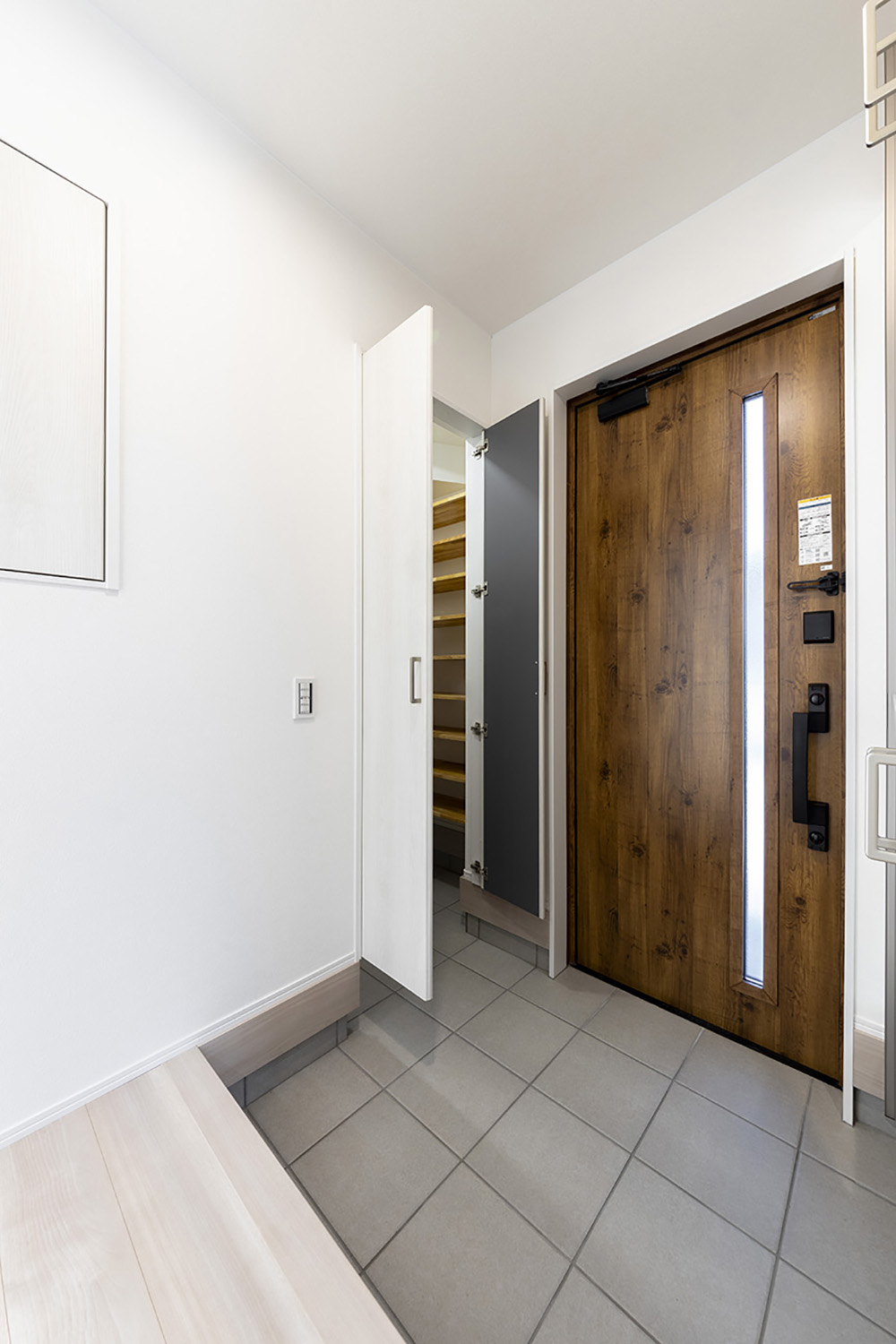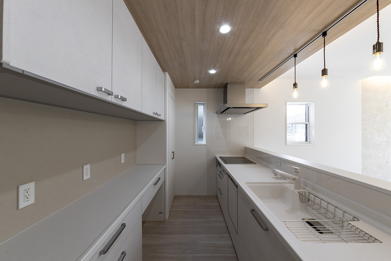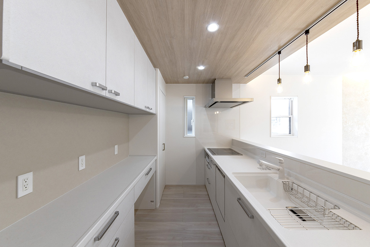 木目天井と優しいホワイトで統一された、ナチュラル&スタイリッシュなキッチン。直線的なレイアウトは動線もスムーズで、毎日の家事が快適に。