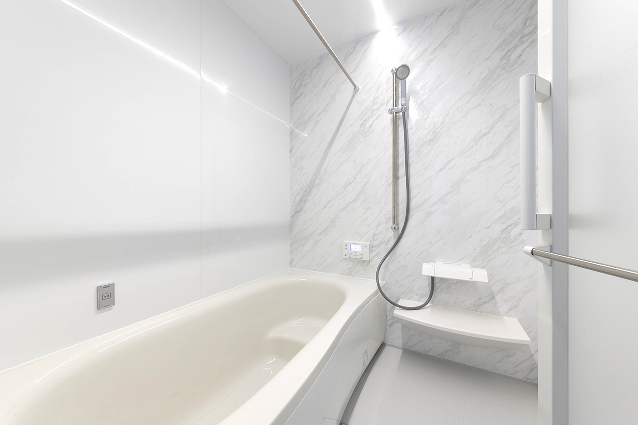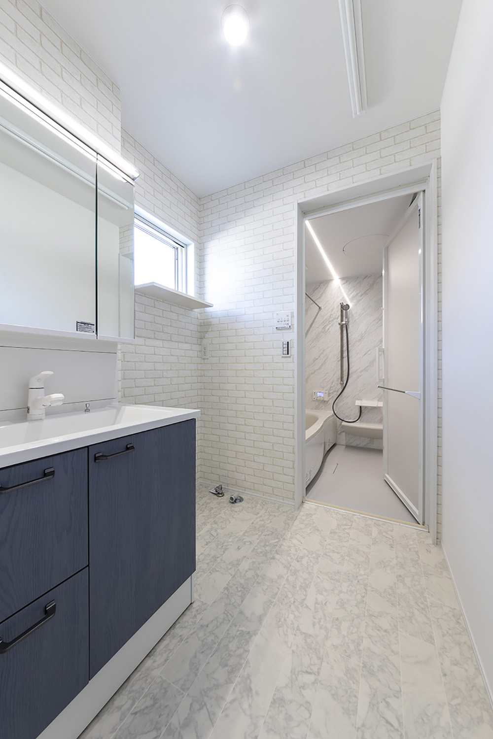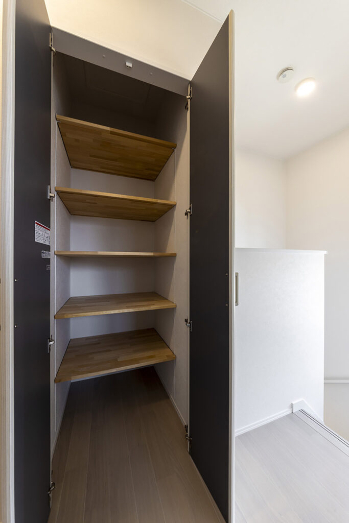 木目天井と優しいホワイトで統一された、ナチュラル&スタイリッシュなキッチン。直線的なレイアウトは動線もスムーズで、毎日の家事が快適に。