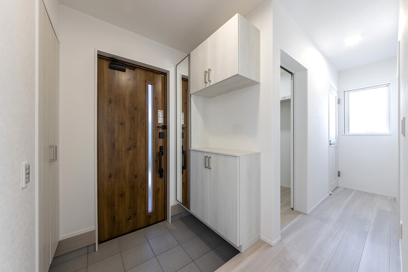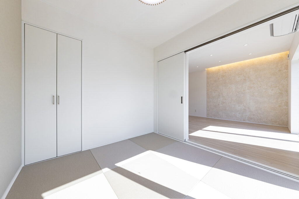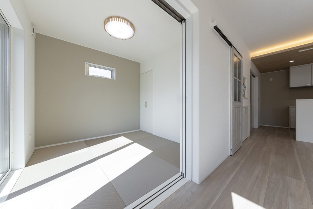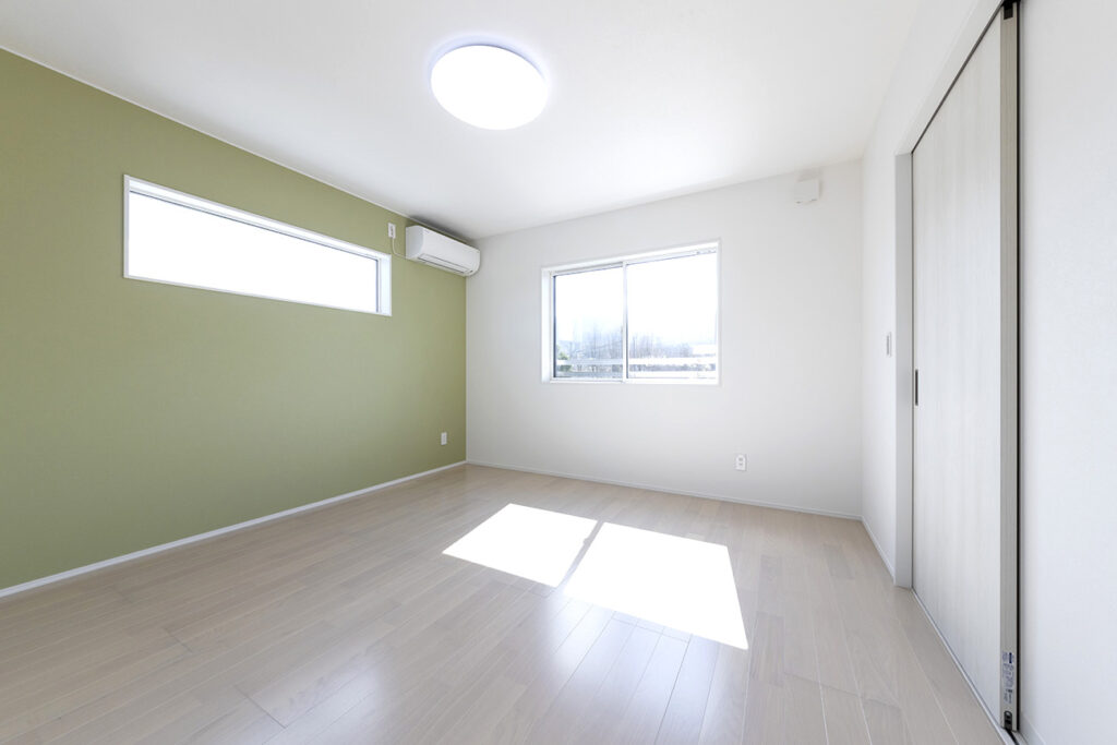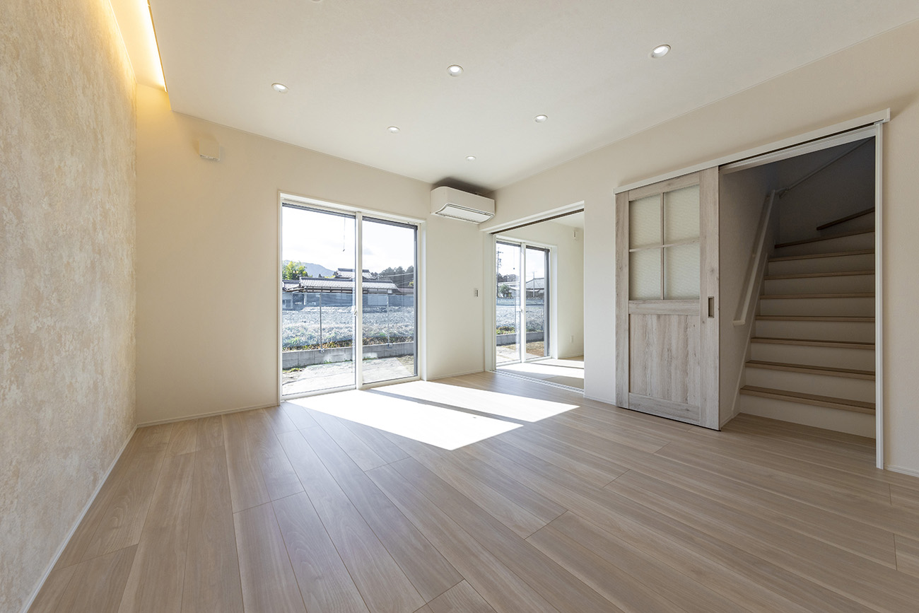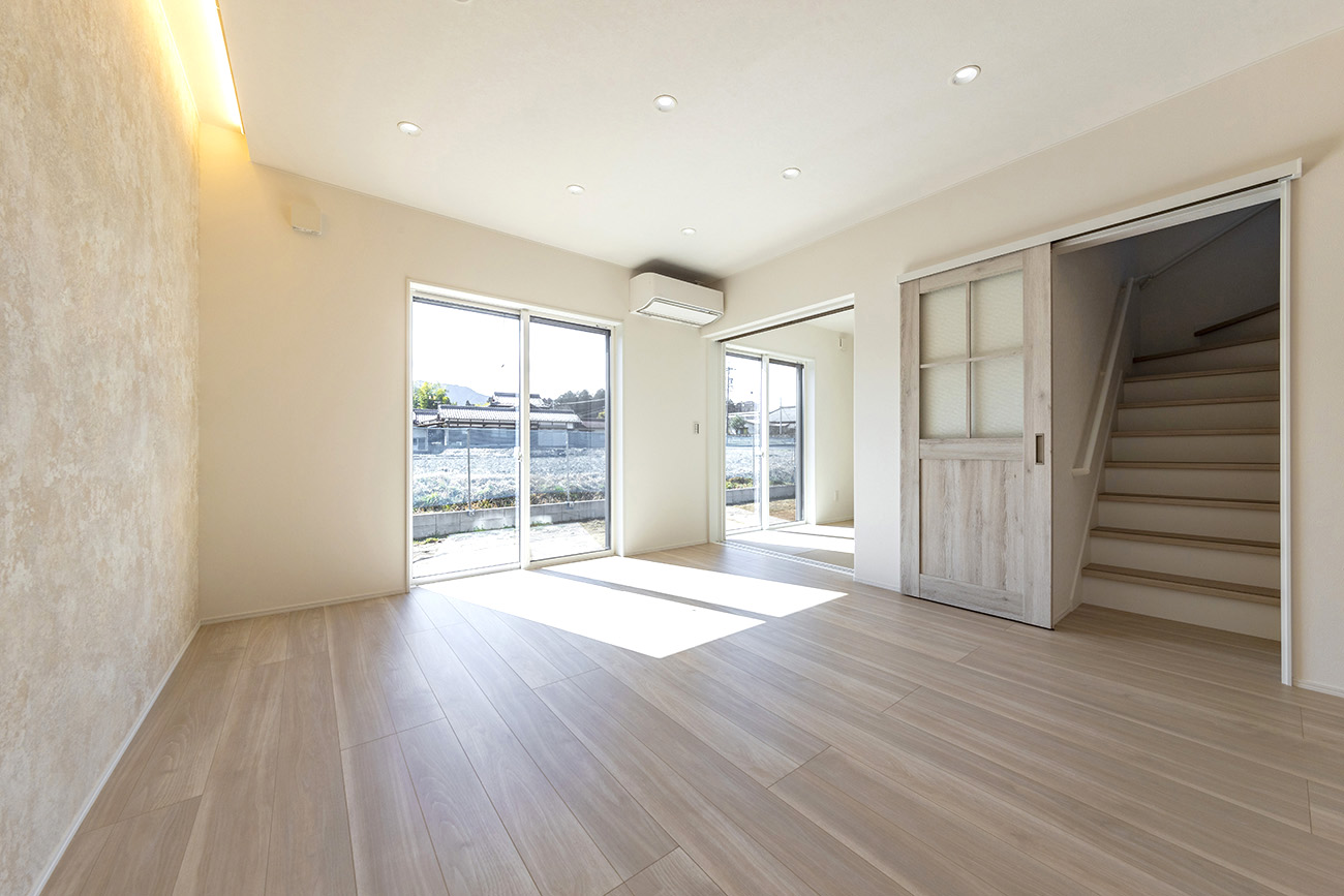 明るい木目の床と大きな窓が開放感を生む、ナチュラルテイストのリビング。南向きの採光で、日中は照明いらずのやさしい明るさ。アクセント壁と間接照明が空間に上質感を添え、落ち着きのある暮らしを演出します。