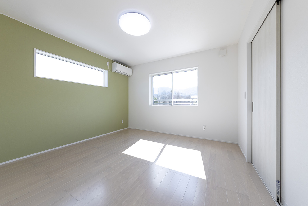 やさしいグリーンのアクセントクロスが印象的な洋室。ナチュラル色のフローリングと白を基調とした壁面が、空間全体に明るさと開放感をもたらします。横長のスリット窓が室内にやわらかな光を取り込み、視線の抜けを生むことで、実際の広さ以上のゆとりを演出。エアコンや収納扉も白系で統一し、すっきりとした印象に仕上げています。寝室やワークスペースとしても、落ち着きある快適な空間です。