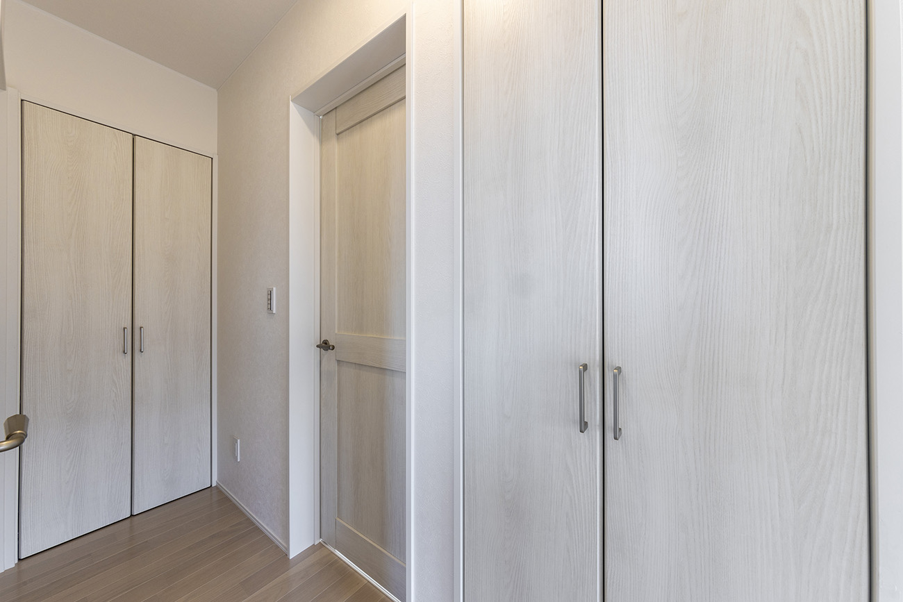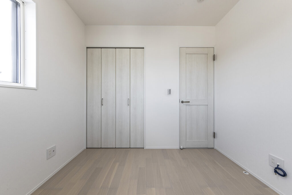白を基調に、明るい木目で統一された落ち着きのある洋室。光を取り込みながらも、落ち着いた雰囲気を保つ設計です。収納力のあるクローゼットも備え、子ども部屋や書斎にも最適な空間です。