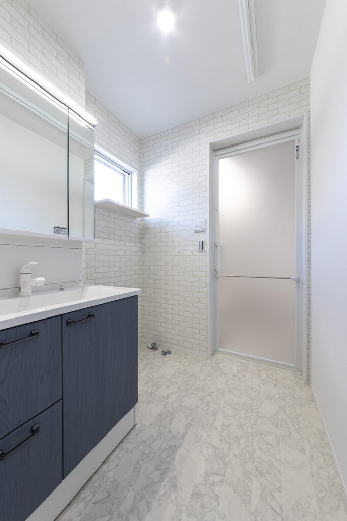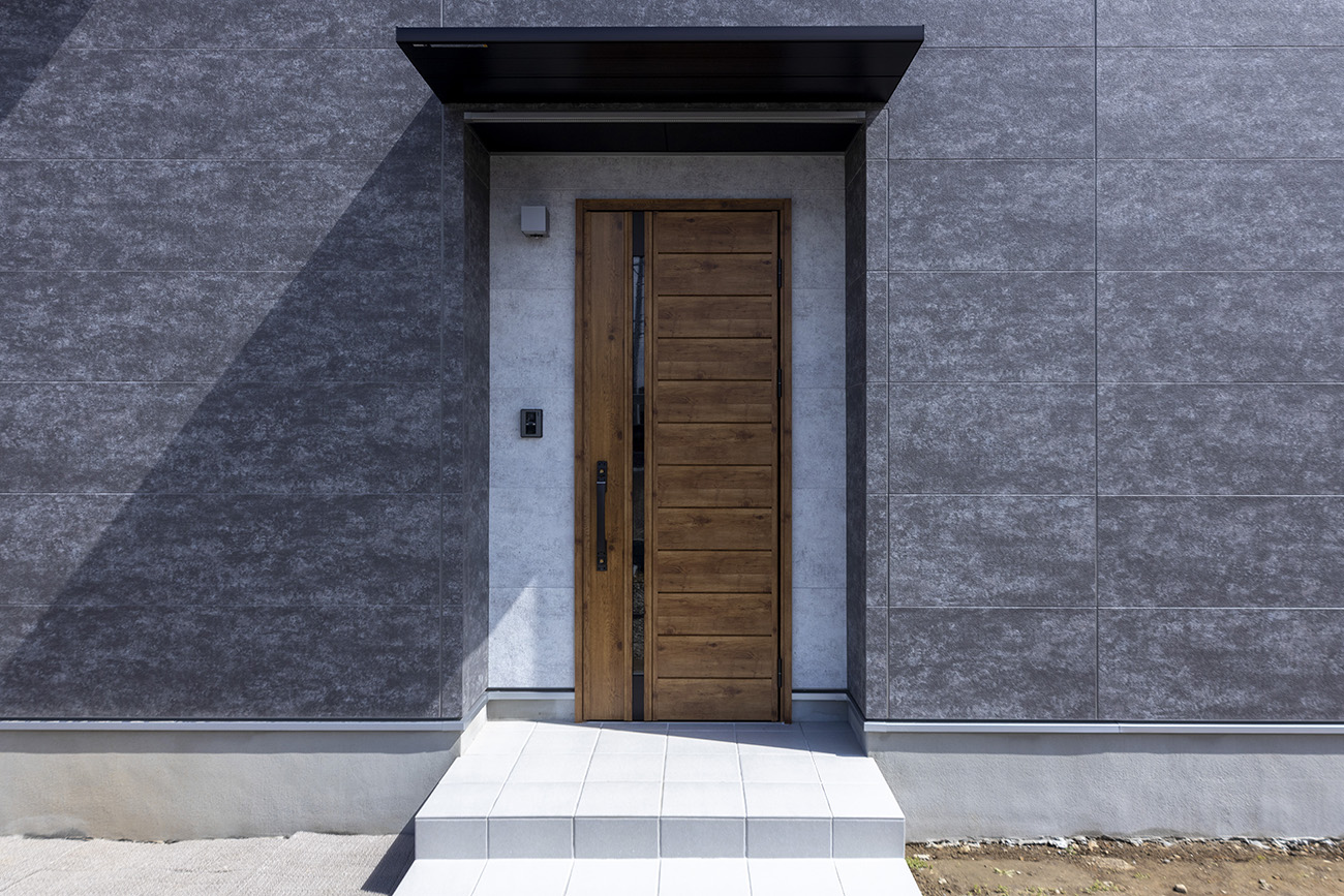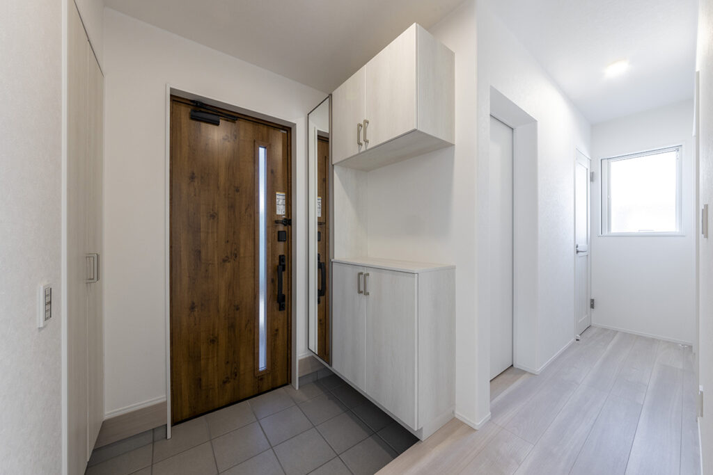 木目の玄関ドアが印象的な、明るく開放的なエントランス。白を基調にした収納と床材が、清潔感とすっきりした印象を与えます。鏡付きのシューズボックスで、空間を広く見せながら実用性も確保しました。
