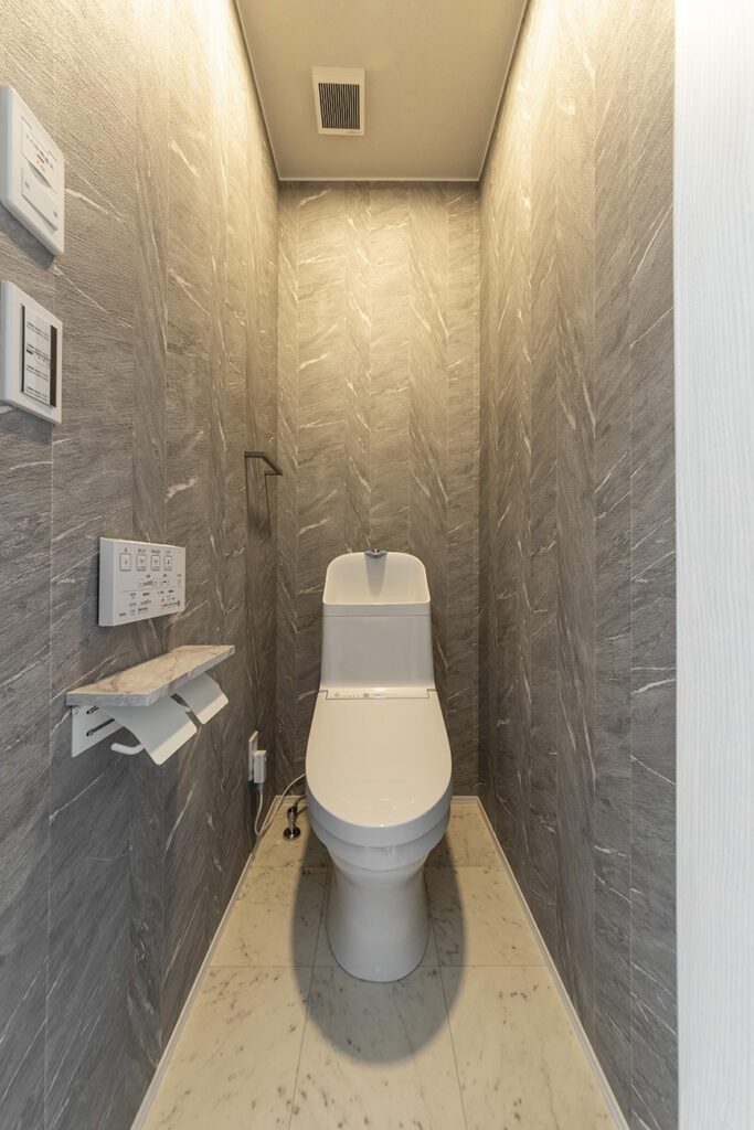 グレーの石目調クロスが印象的な、シックなトイレスペース。大理石調フロアと間接照明で、上質なホテルライクの雰囲気に仕上げました。落ち着きと清潔感を両立した、こだわりの空間です。