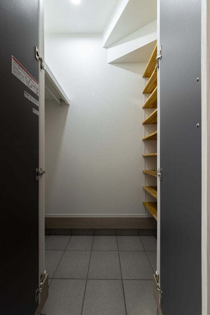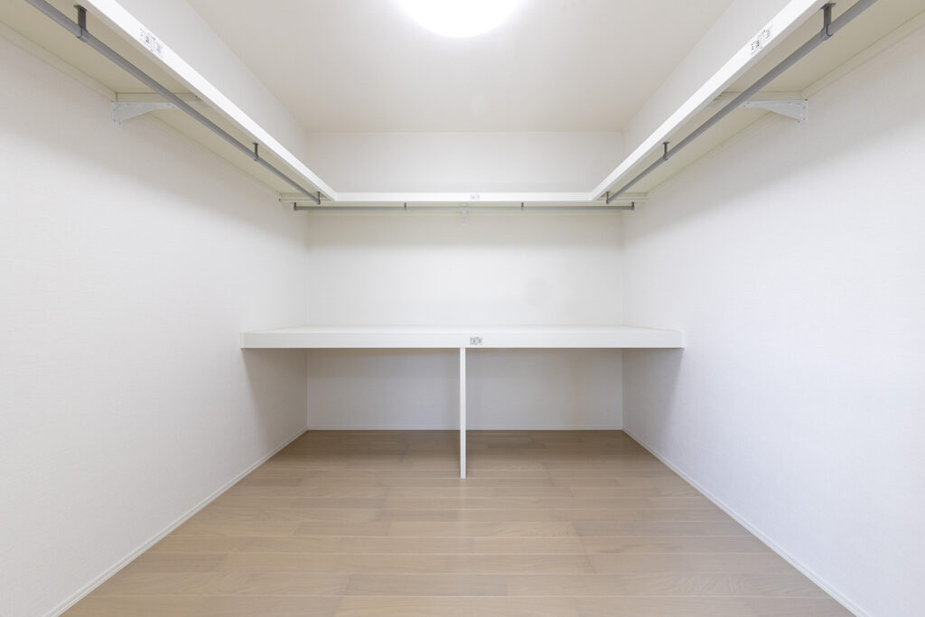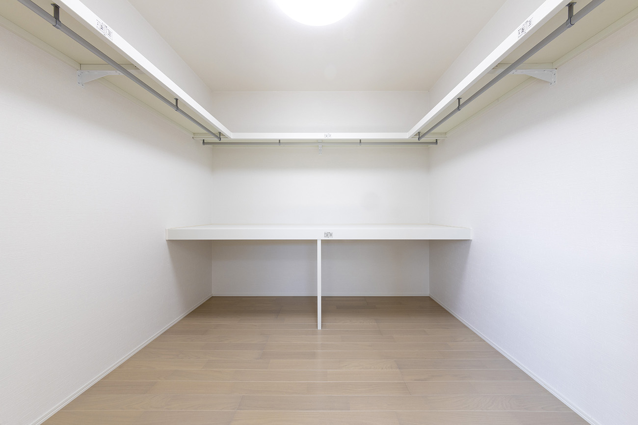 棚とハンガーパイプをL字型に配置した、効率の良いウォークインクローゼット。衣類から小物までたっぷり収納でき、整理整頓がしやすい設計です。シンプルで明るい内装が、使いやすさと清潔感を両立しています。