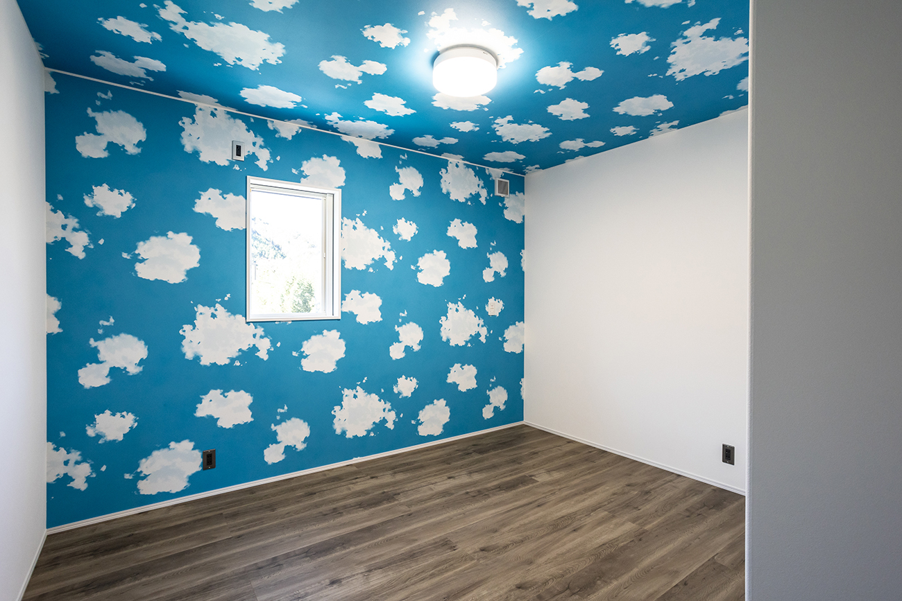 元気いっぱいの男の子のためにデザインされた子ども部屋は、壁と天井をつなぐように貼られた青空クロスが最大の魅力。鮮やかなブルーに浮かぶ白い雲が、まるで本物の空の中にいるかのような臨場感を演出し、お子さまの想像力を育む空間となっています。