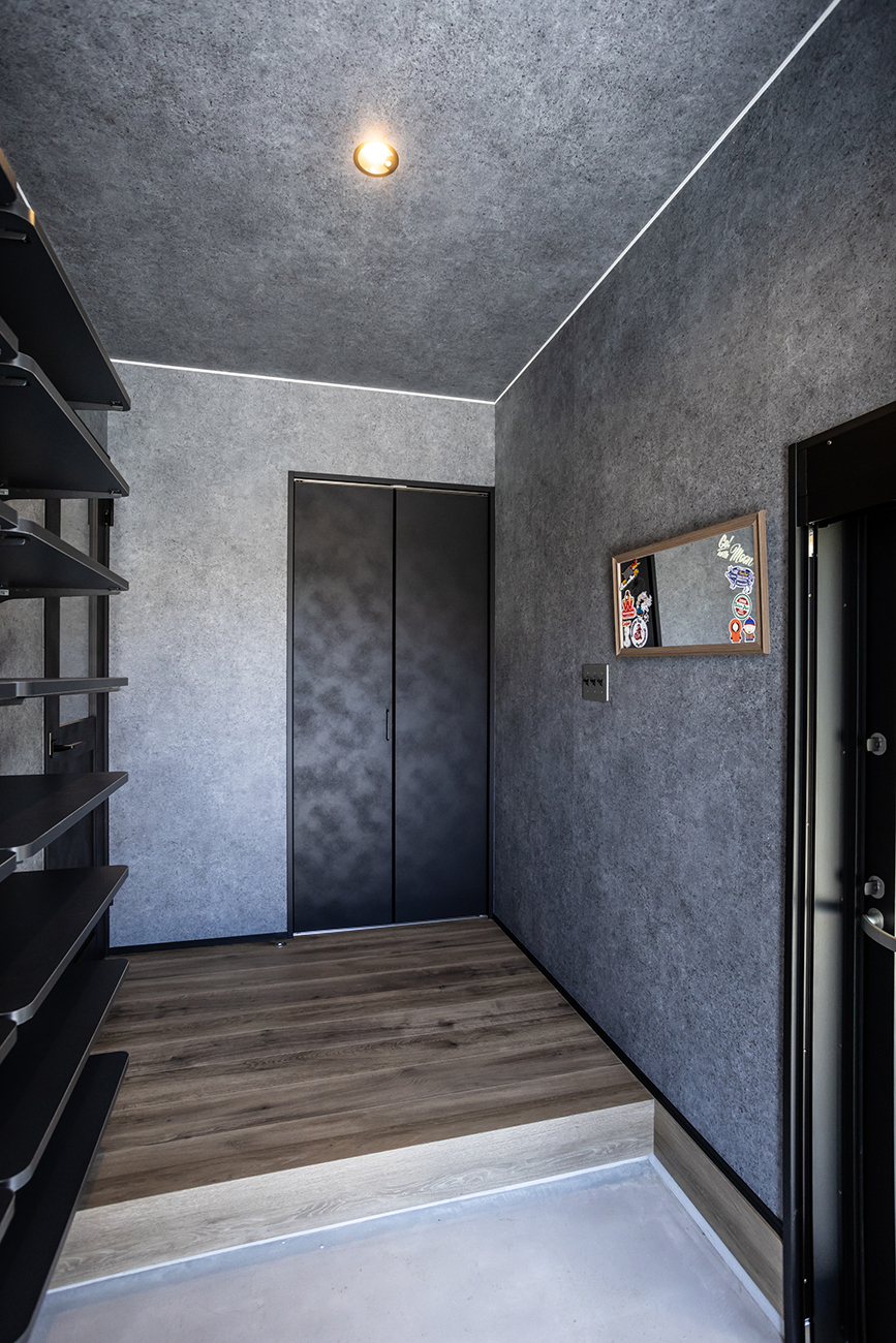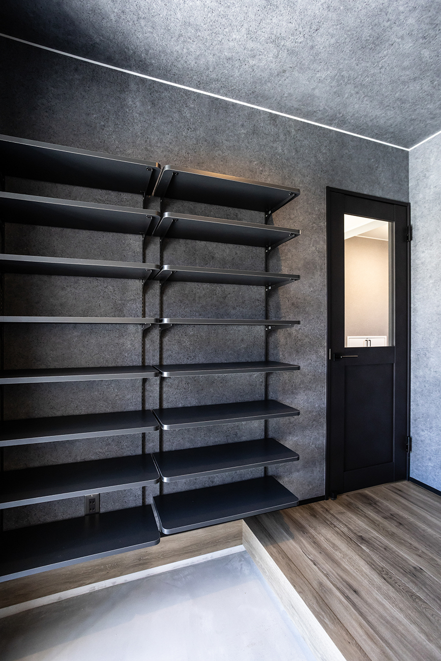 玄関ホールにはあえて“靴箱”を置かず、壁一面をオープンな可動棚に。デザイン性と収納力を両立させたこのスタイルは、日常的に使う靴やアイテムの出し入れがしやすく、見た目もスッキリとした印象に。グレーのクロスやブラックの建具でまとめられた空間は、落ち着きとモダンさを兼ね備えています。 ガレージから直接アクセスできる動線も大きなポイント。車での買い物帰りや雨の日にも便利で、実用性に富んだ設計です。玄関からガレージ、そして室内へのつながりは、まさに「暮らしやすさ」を体現した動線設計。