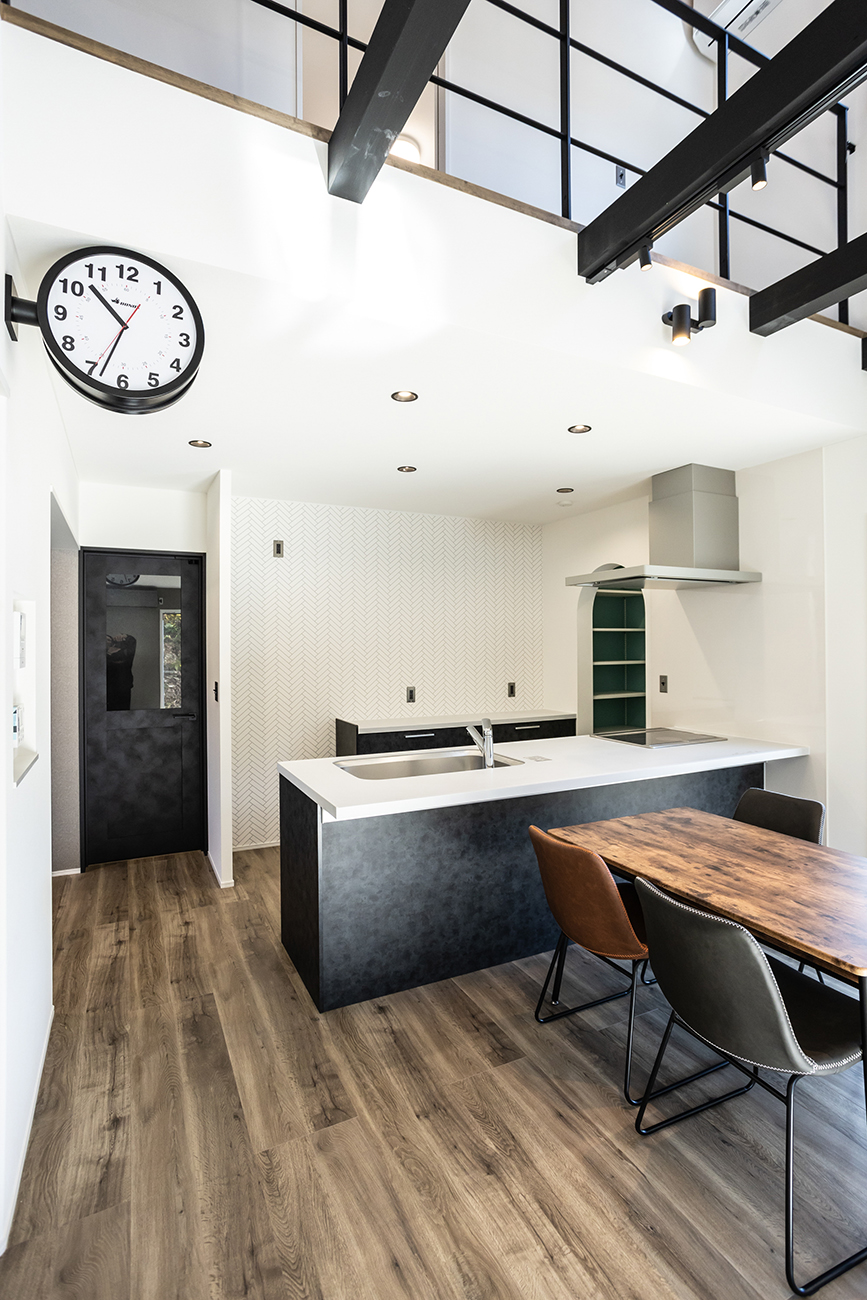 ダイニングキッチンから見上げると、吹き抜けを通して2階へとつながる開放的な空間が広がります。構造を活かしたブラックの鉄骨梁とアイアン手すりが、白壁と絶妙なコントラストを描き、インテリアの一部としても存在感を放っています。