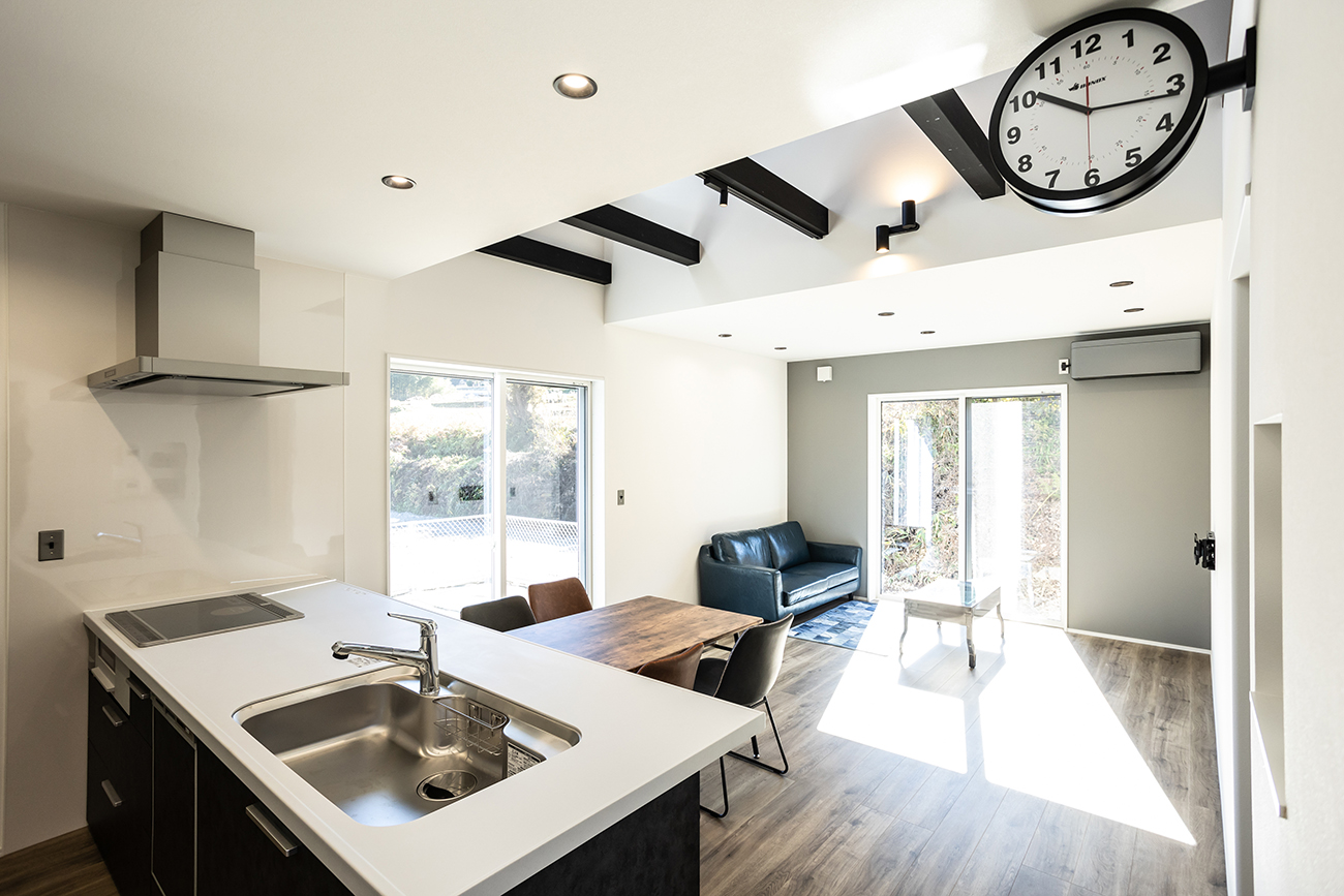 このLDK空間は、天井の高さを活かした梁見せ設計と、南面の大開口から差し込む自然光によって、開放感とぬくもりを感じられる空間に仕上がっています。モノトーンを基調としたシックな配色に、木目のフローリングと家具が温かみを添え、落ち着いた暮らしを演出。