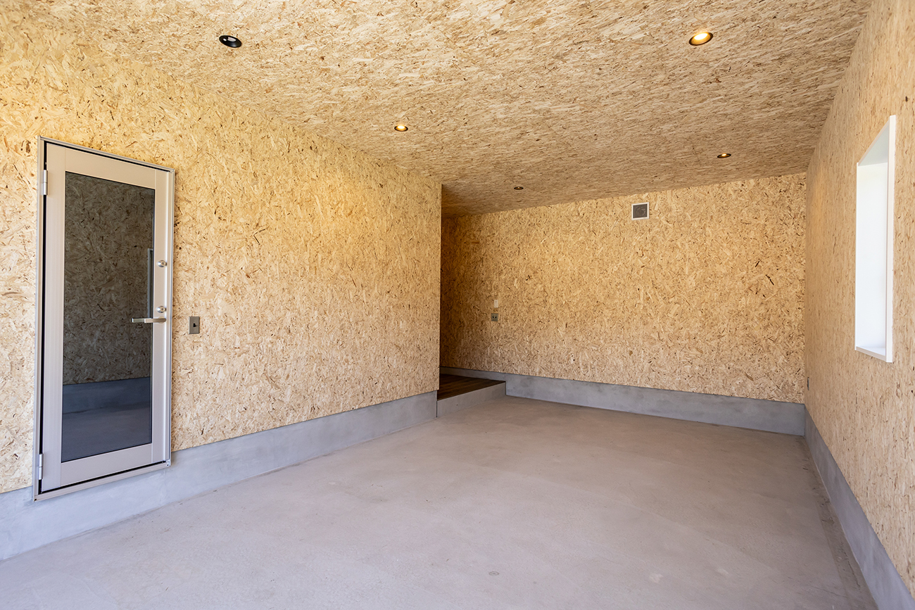 このガレージは、ご主人様の強いこだわりにより設計された特別な空間です。壁・天井にはOSB(配向性ストランドボード)を使用し、木材の素朴な風合いと荒々しい質感を活かした、個性的で温もりのある仕上がりとなっています。インダストリアルな印象を残しつつも、どこか安心感のある落ち着いた空間に。