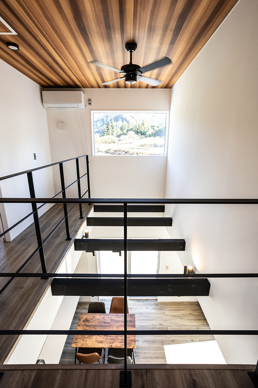 正面の大開口窓は、周囲の自然を“絵のように”切り取る設計で、四季折々の風景を日常に取り込む役割を果たしています。まさに「家の中に居ながら、外とつながる」感覚を味わえる贅沢なひととき。 天井には木目のパネリングを施し、視線が上に抜けた際の美しさと温かみを両立。空間全体に奥行きと立体感を生み出しています。また、アイアン手すりが空間を引き締め、モダンで少しインダストリアルな印象もプラス。