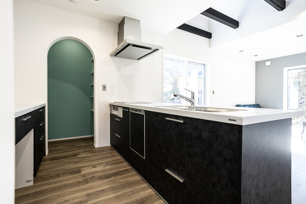 キッチン奥には、アーチ状の開口部が目を引くパントリースペースを配置。やわらかな曲線が空間に優しさを加えると同時に、奥行きと奥ゆかしさを演出しています。中は可動棚付きで収納力も十分。ストック食品や調理器具などをすっきりとまとめられるため、キッチンをいつでも美しく保てます。 「見せる」と「隠す」のバランスが取れた、実用性と美しさを兼ね備えたキッチン動線が、毎日の家事を軽やかにしてくれます。
