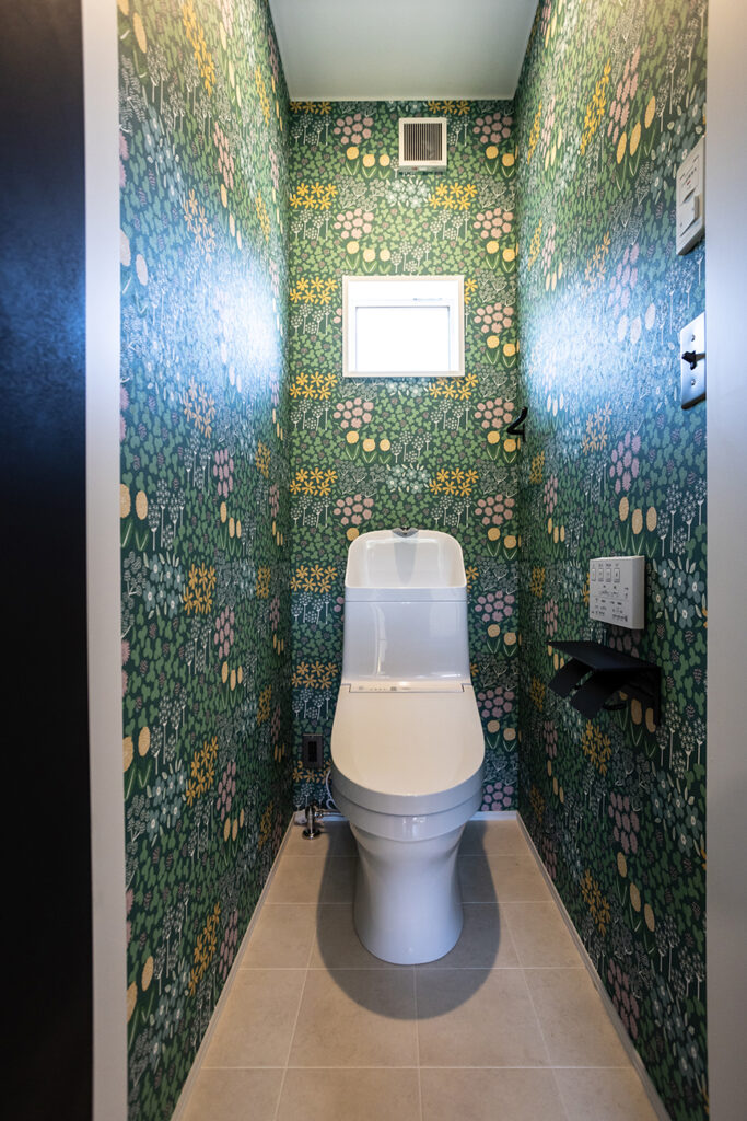 このトイレ空間は、お施主様の「クロスにこだわった家づくり」を象徴する一室です。壁全面にあしらわれたボタニカル柄のクロスは、グリーンを基調にピンクやイエローの差し色が映えるデザインで、まるで一枚の絵画のように空間を彩ります。